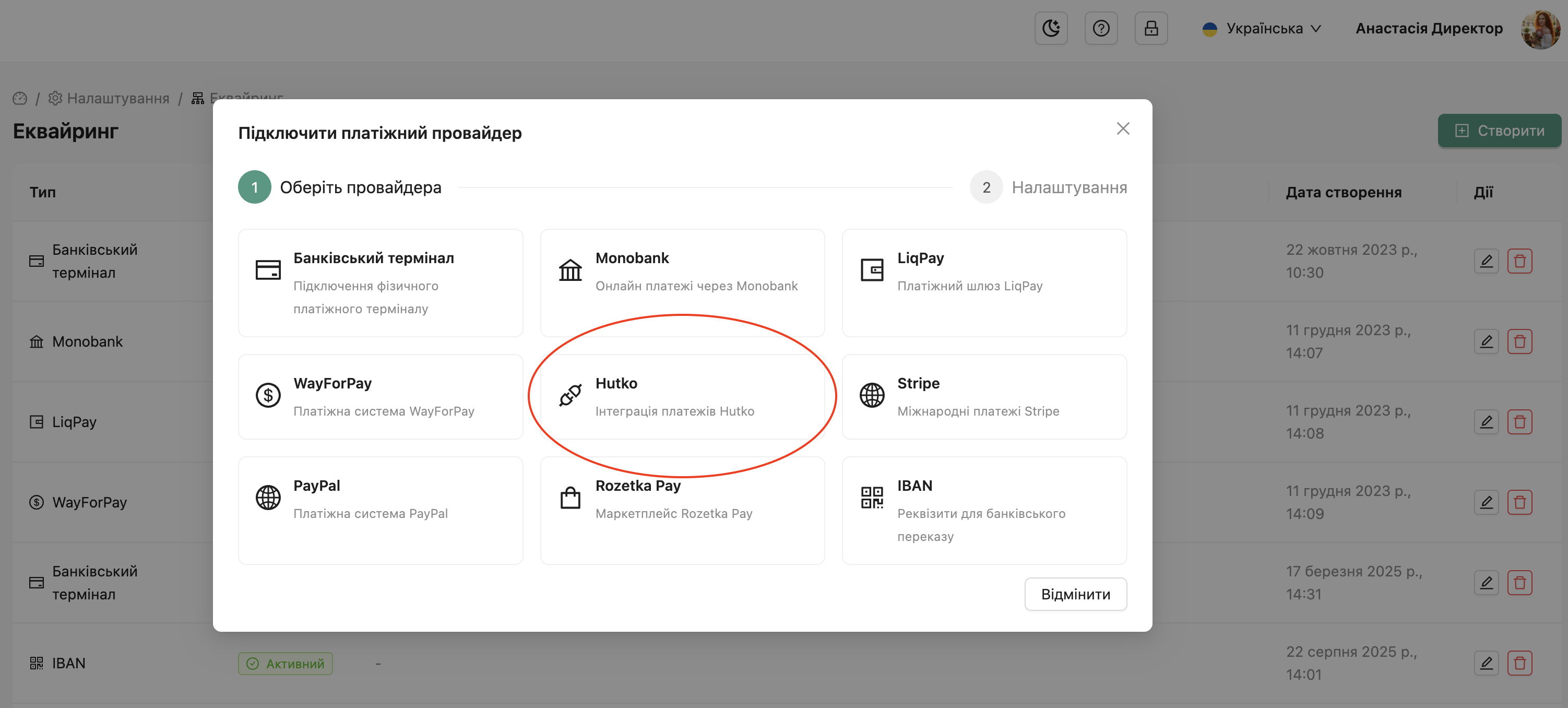 В Flora24 перейдіть в Налаштування → Еквайринг і натисніть Створити.. Оберіть Hutko