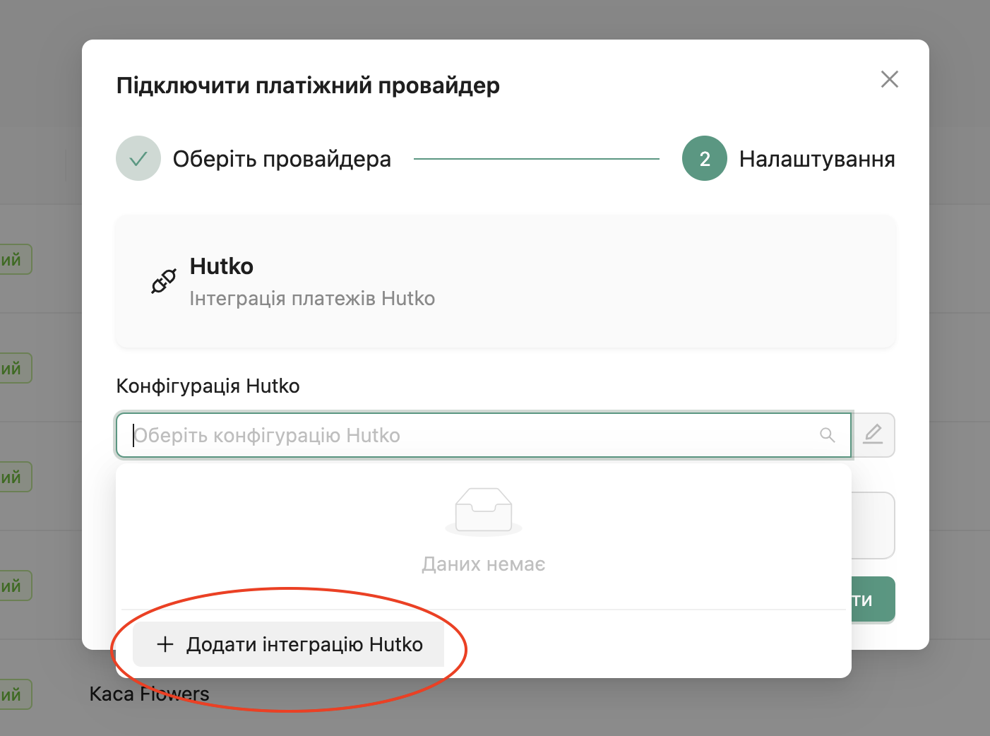 - Якщо конфігурація Hutko ще не створена, натисніть Додати інтеграцію Hutko.