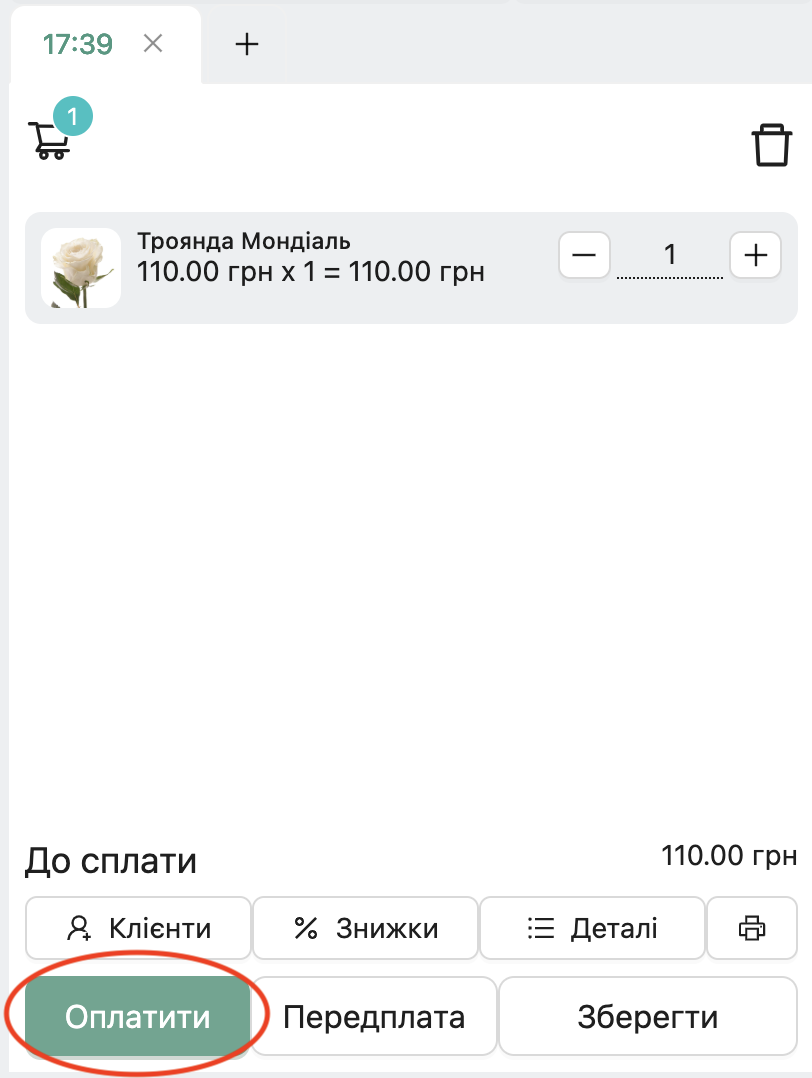- На екрані Продажу виберіть товар(и) та натисніть Оплатити.