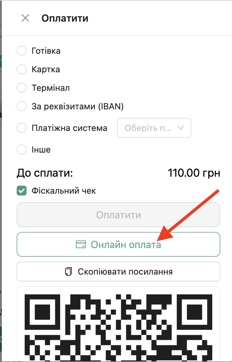 - Скопіювати посилання — щоб надіслати клієнту посилання на оплату вручну.