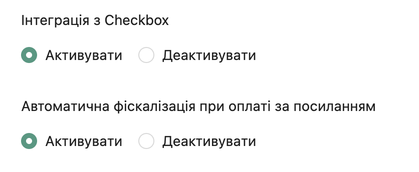 - Активуйте Checkbox в Flora24. Налаштування → Компанія, в полі Інтеграція з checkbox оберіть Активувати