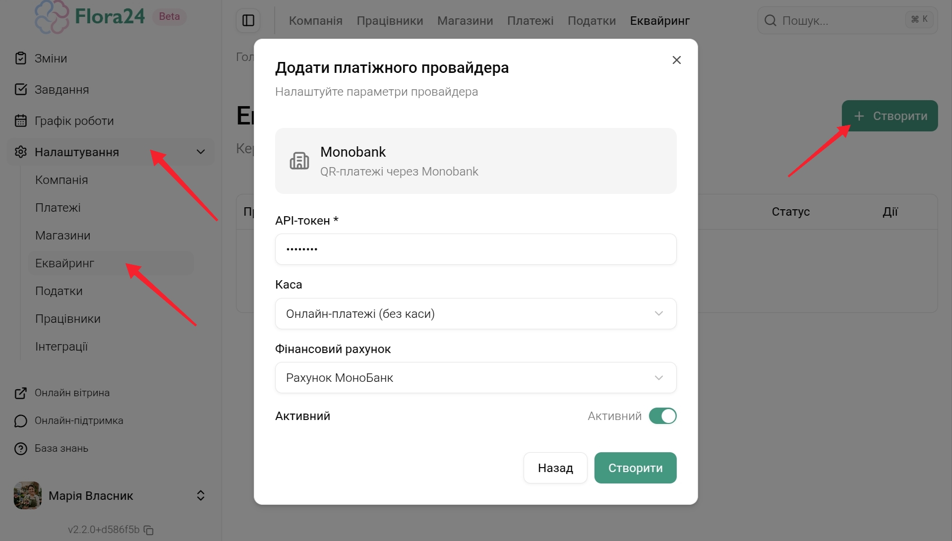 - У адмін-панелі Flora24 перейдіть у розділ Налаштування → Еквайринг → Створити