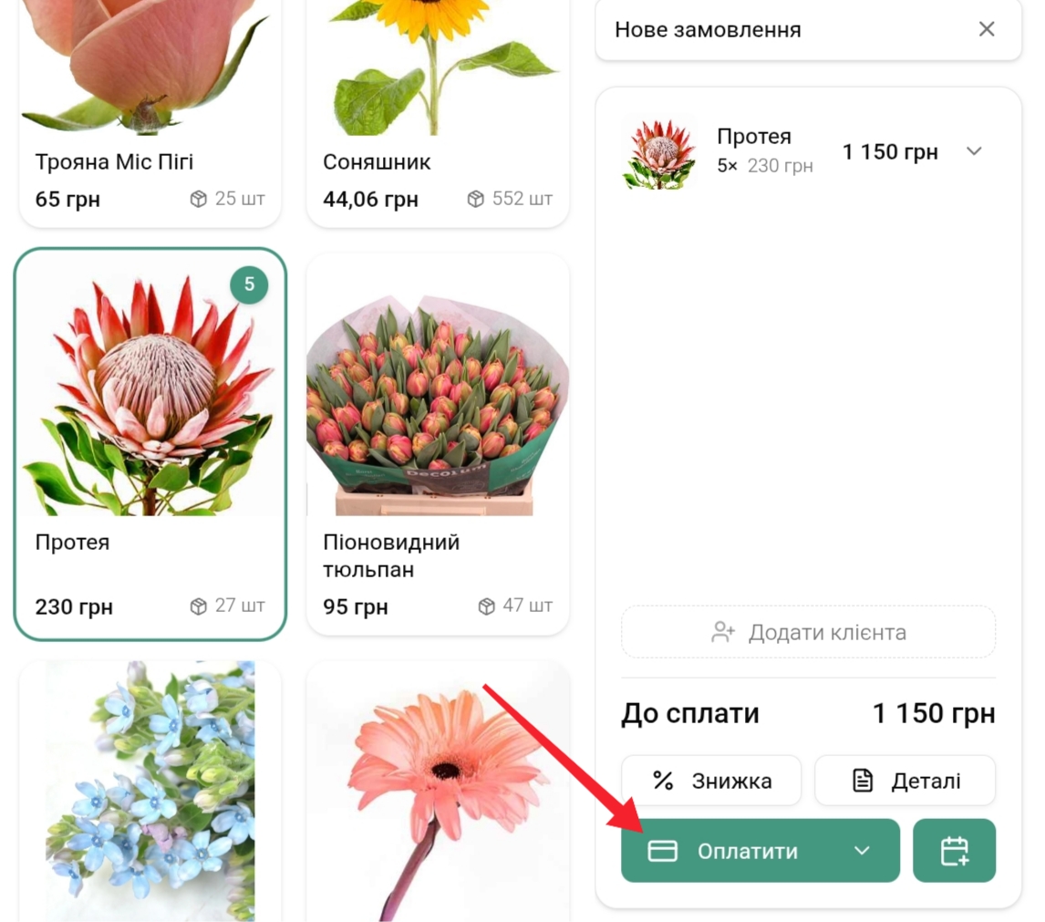 На екрані продажу додайте товар у чек та натисніть кнопку Оплатити