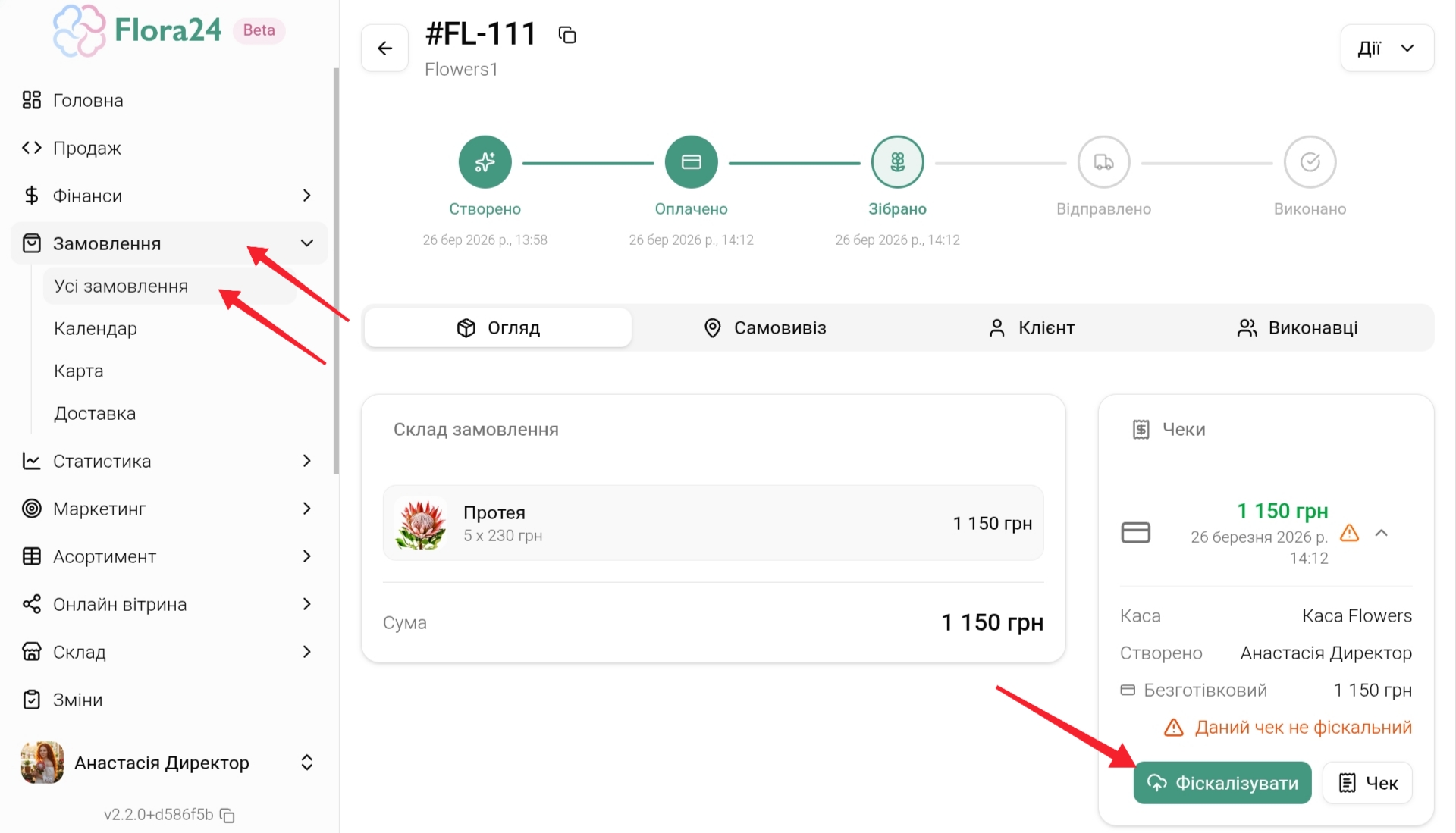 - Обовʼязкова передумова для фіскалізації чеків - підключена і налаштована інтеграція з ПРРО Checkbox або ПРРО [Вчасно.Каса] (https://help.flora24.online/docs/v2/integrations/prro-vchasno-kasa/)