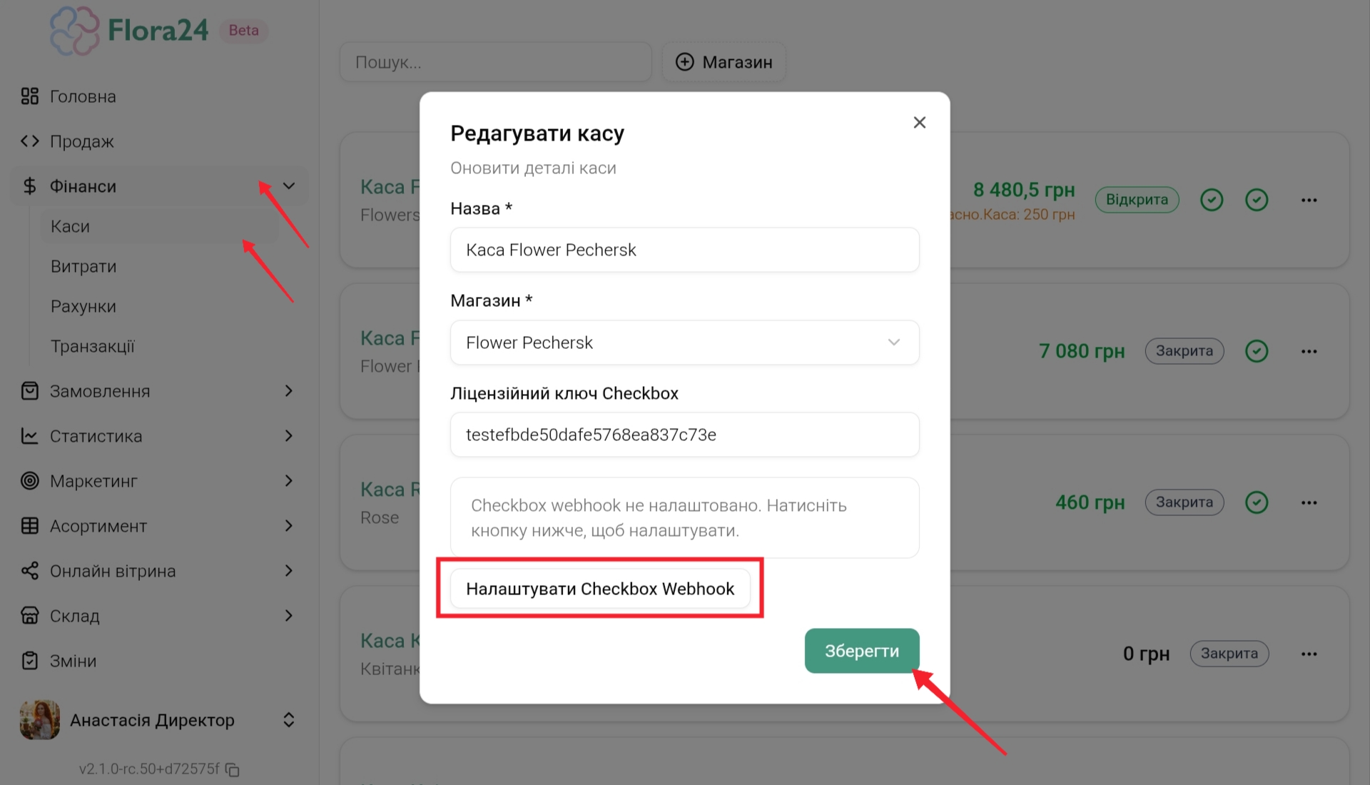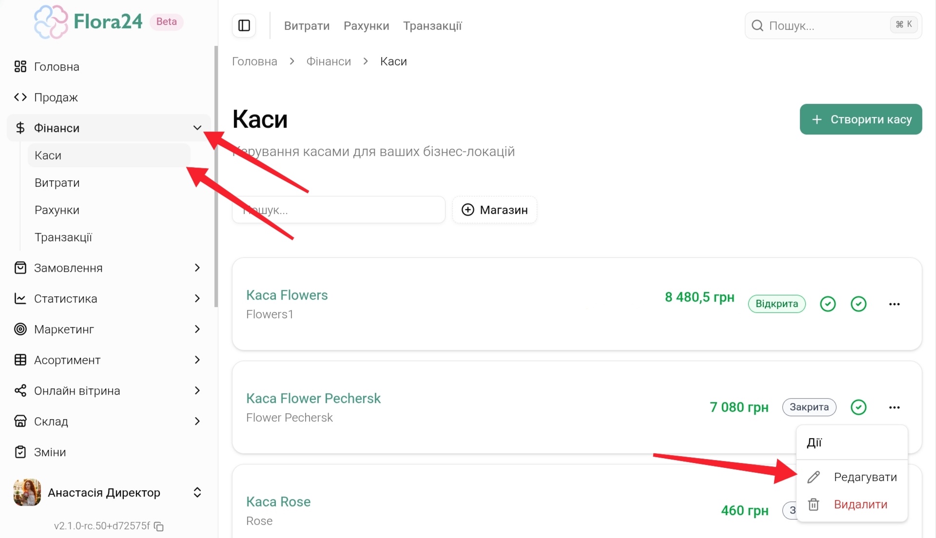 Перейдіть у Адмін-панель → Фінанси → Каси → Три крапки(…) → Редагувати