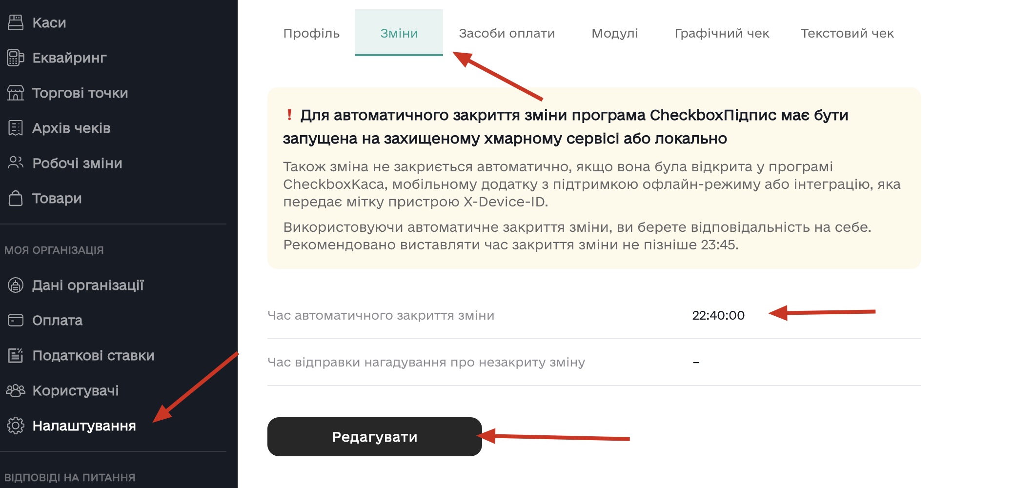 Натисніть Налаштувати Checkbox webhook та налаштуйте автоматичне закриття каси у кабінеті Checkbox.