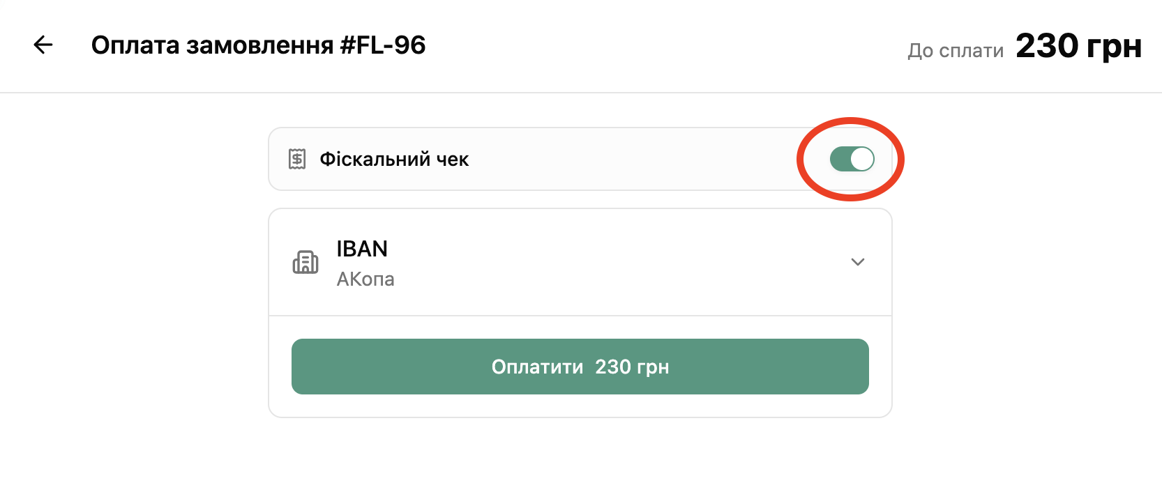 Після налаштування інтеграції з ПРРО на екрані продажів під час оплати з’явиться опція фіскалізації — прапорець «Фіскалізувати» буде встановлений за замовчуванням.