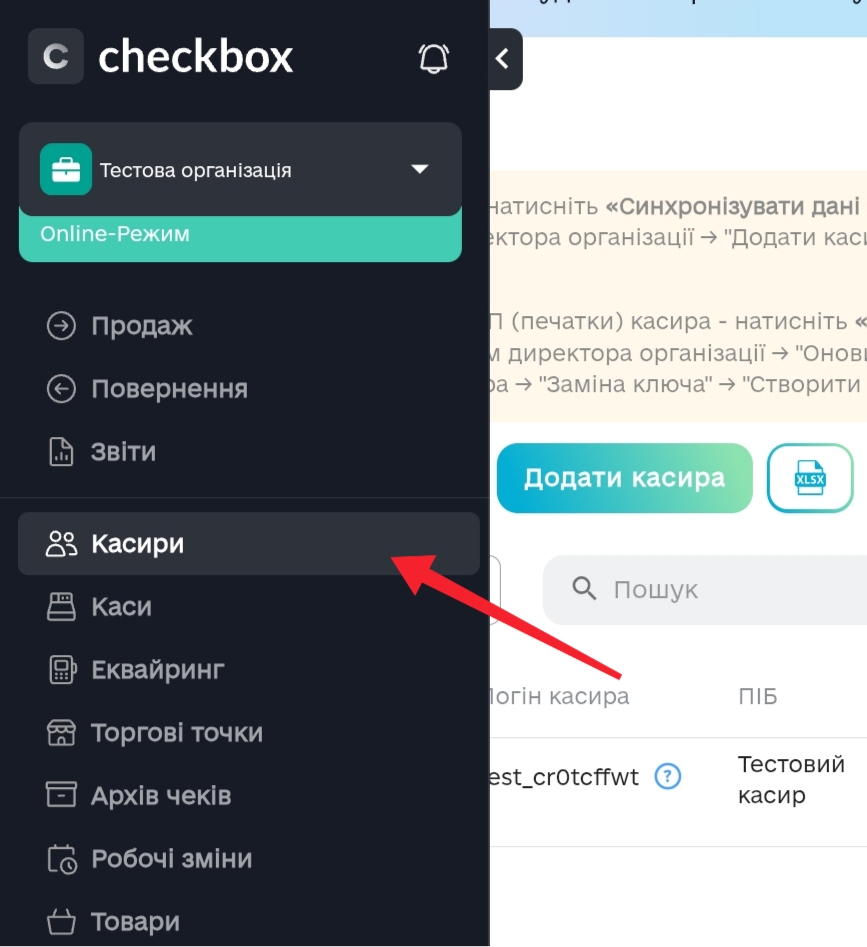 - У кабінеті Checkbox перейдіть у розділ Касири