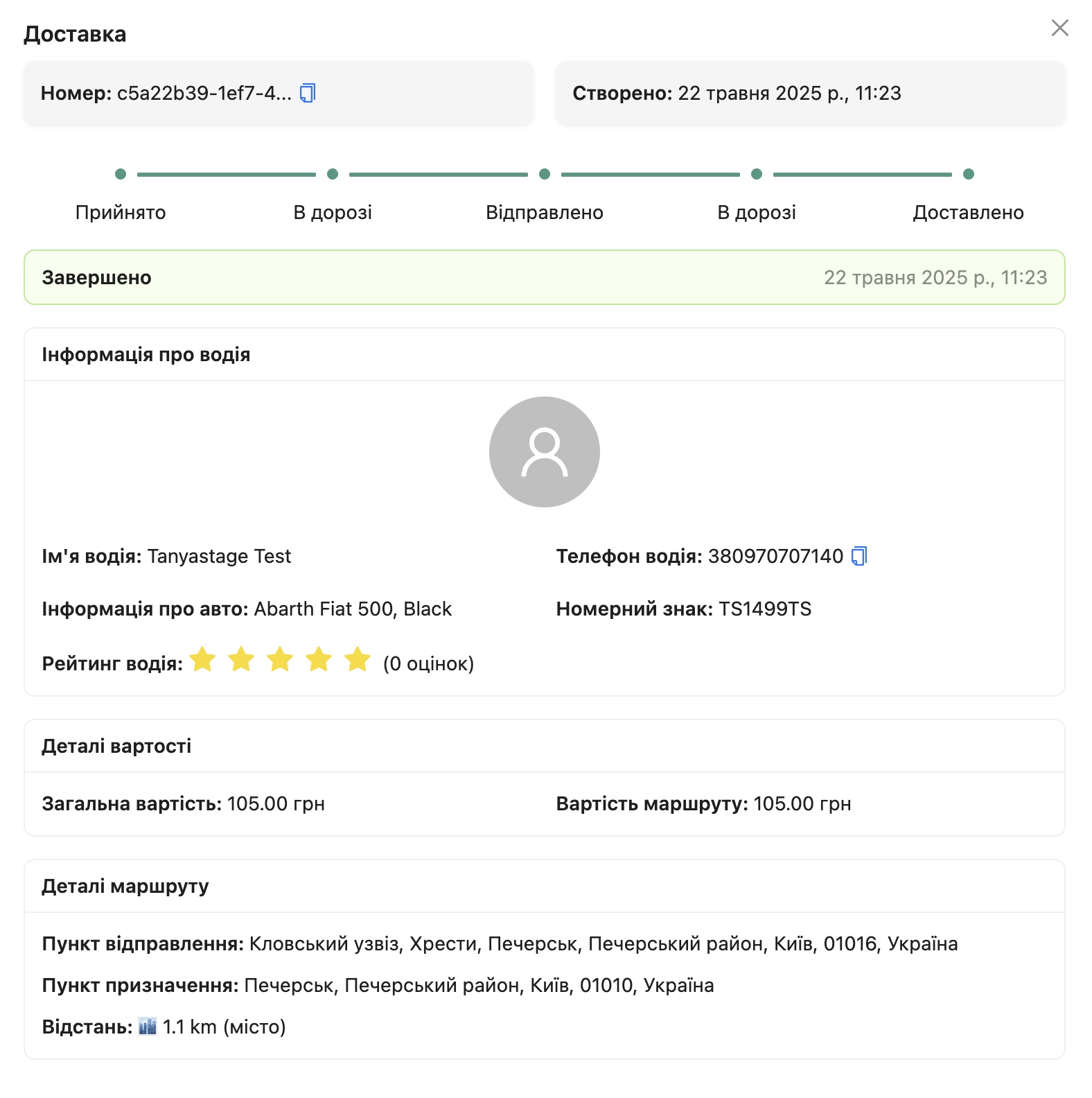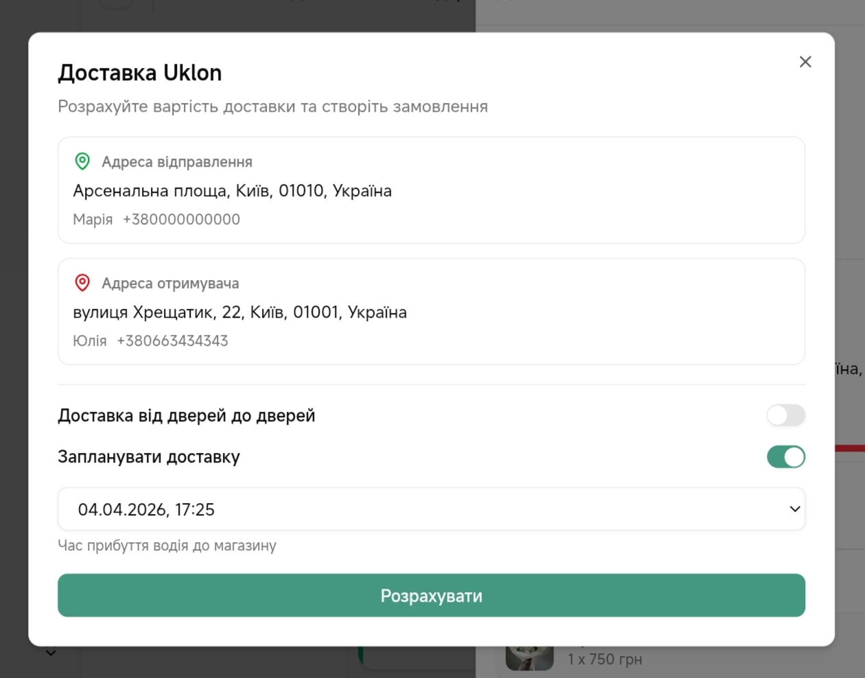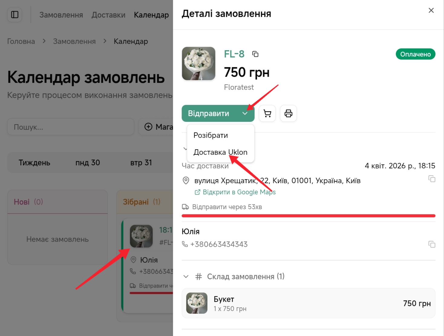 Після цього доставка буде передана в Uklon — очікуйте підтвердження від водія. Вікно можна закрити, а для перегляду статусу достатньо знову відкрити замовлення через календар та натиснути Доставка Uklon