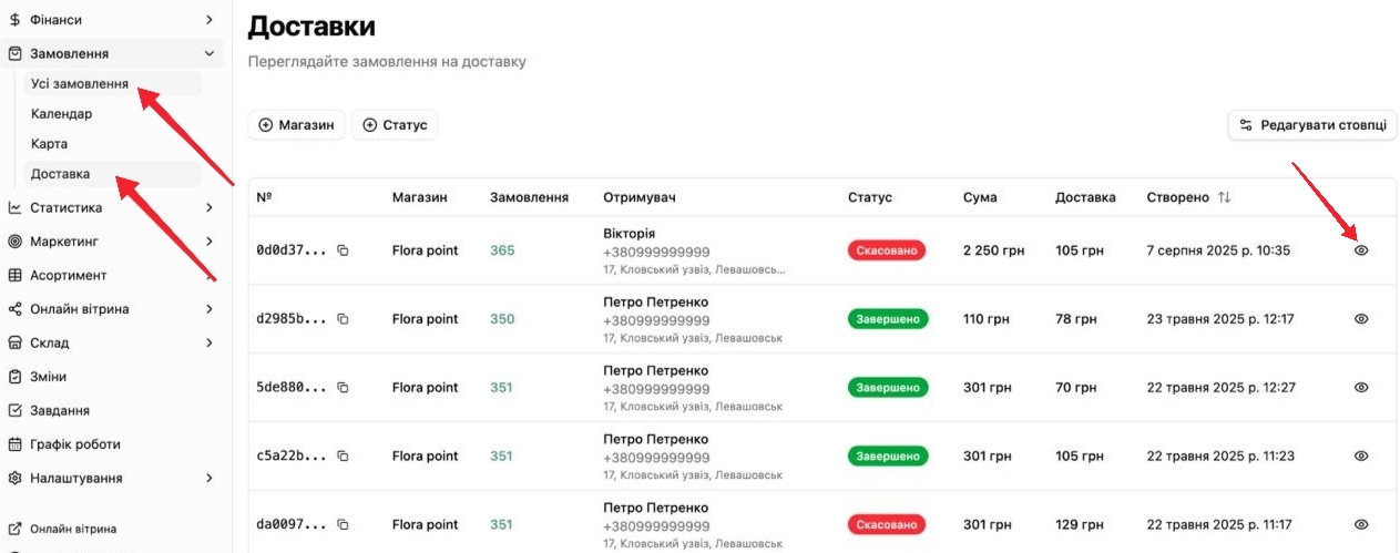 - Історію доставок можна переглянути на сторінці Замовлення → Доставки, щоб переглянути деталі замовлення, натисніть на іконку ока