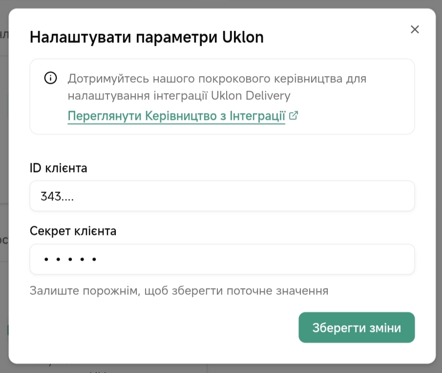 Після активації натисніть Налаштування та введіть ID Клієнта і секрет клієнта з отриманого листа від Uklon. Натисніть Зберегти зміни