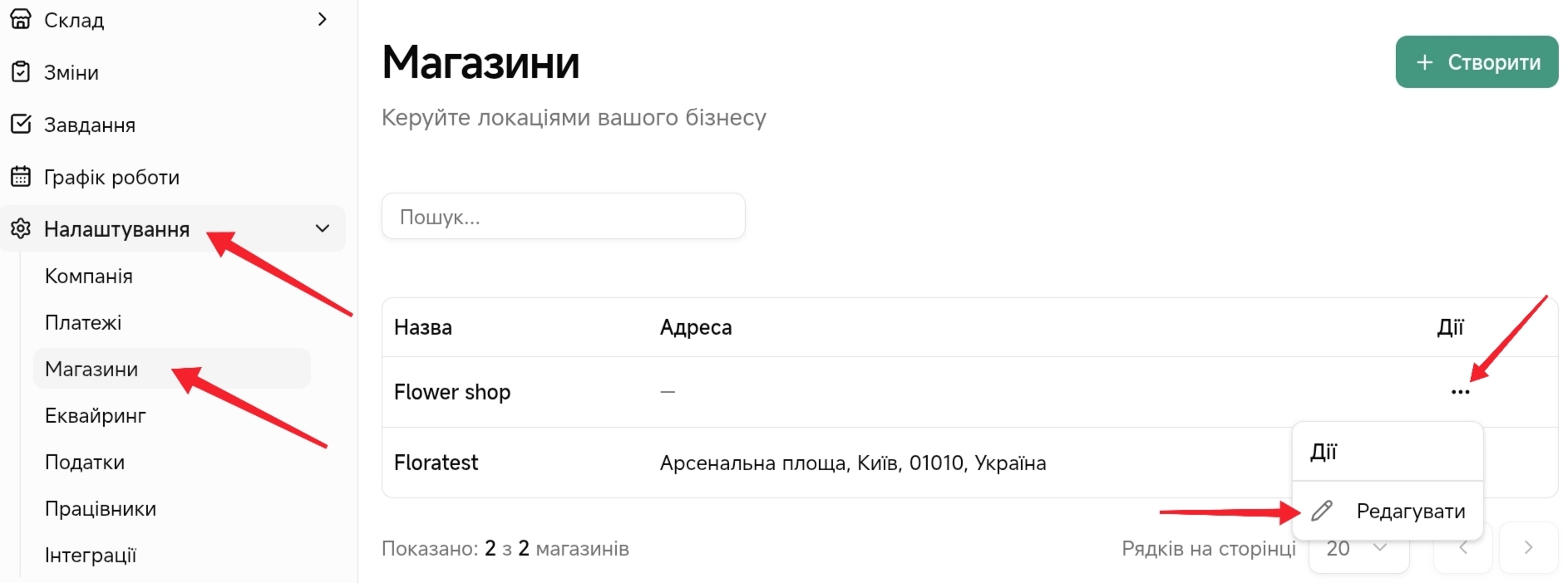 Перейдіть у Налаштування → Магазини. Оберіть магазин натиснувши на 3 крапки (…) → Редагувати → Адреса: