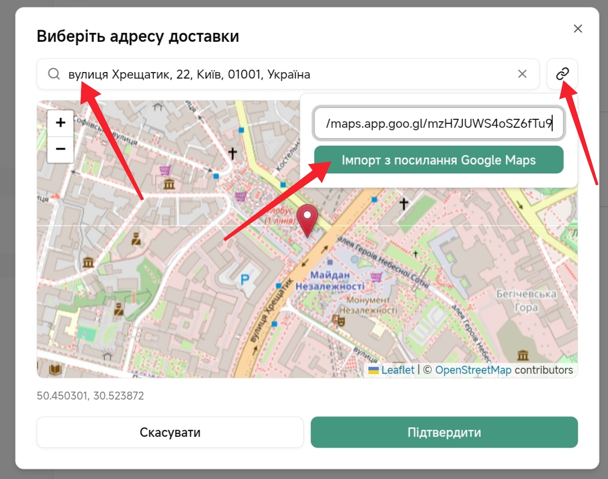 - Адресу доставки (можна ввести вручну або імпортувати посилання з Google Maps натиснувши на ланцюжок біля пошуку)