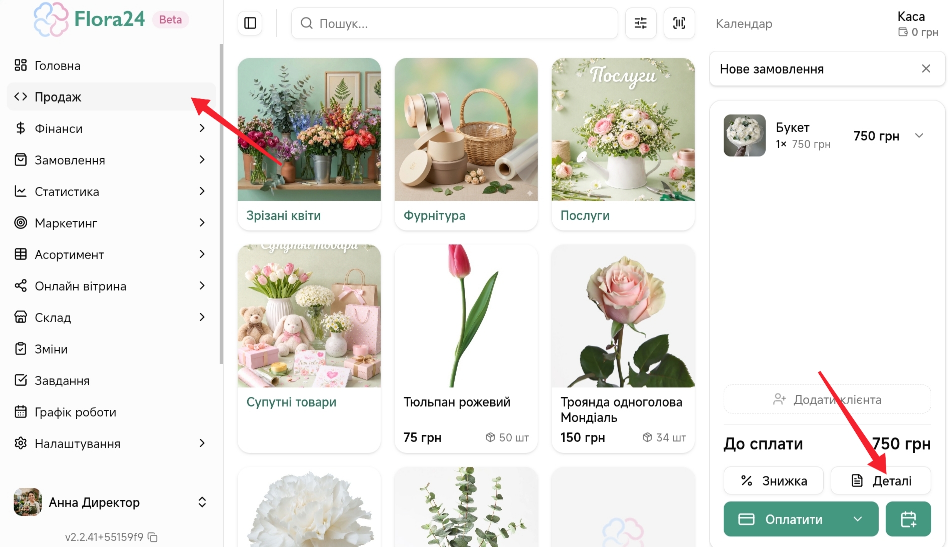 - Перейдіть в адмін-панелі на сторінку Продаж та створіть нове замовлення. Додайте товари та натисніть кнопку Деталі