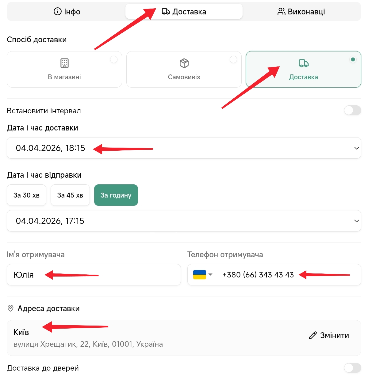 - У вкладці Доставка оберіть спосіб Доставка замість В магазині, після чого заповніть дані отримувача та інформацію щодо доставки: