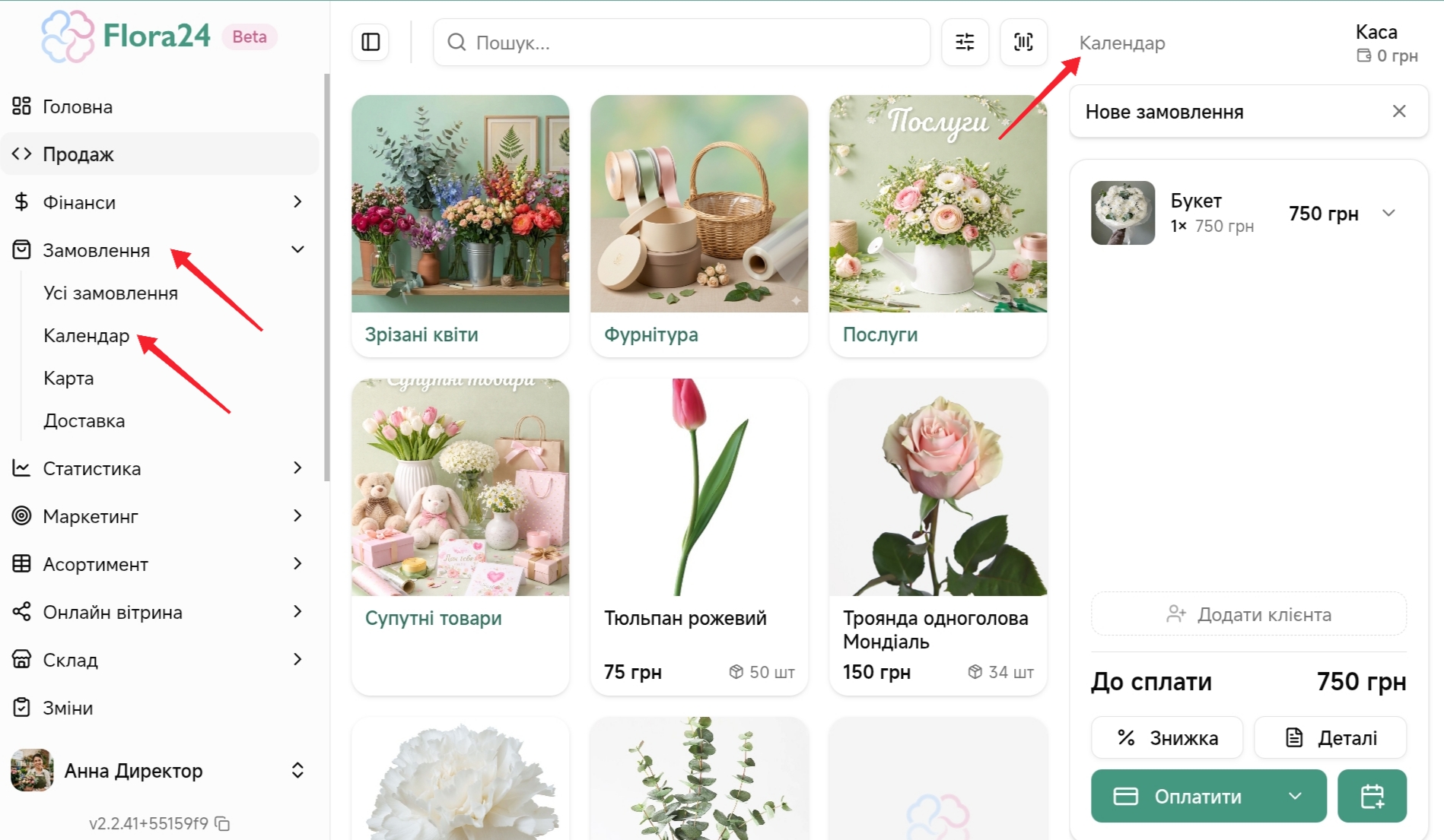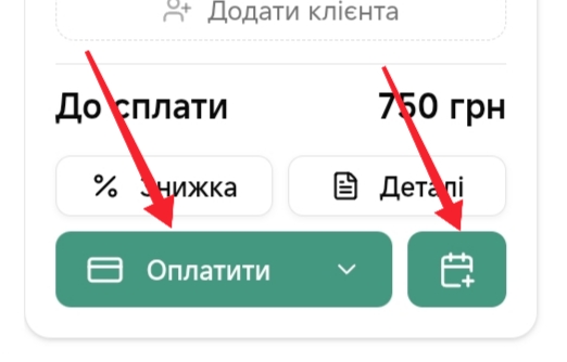 - Після збереження натисніть на іконку календаря біля кнопки оплати, або кнопку оплати щоб прийняти оплату за замовлення — замовлення буде створене та автоматично відобразиться в календарі.