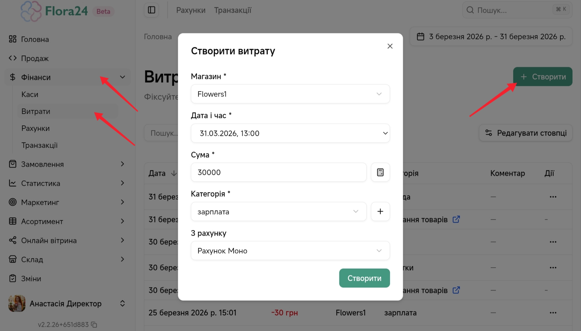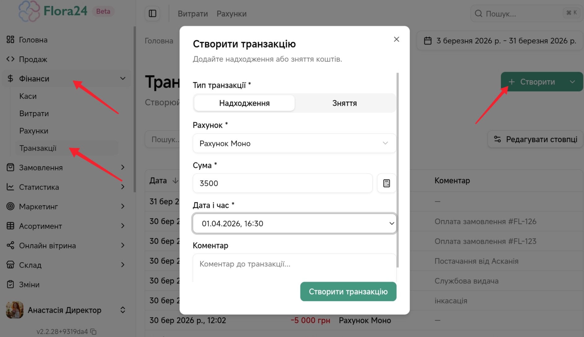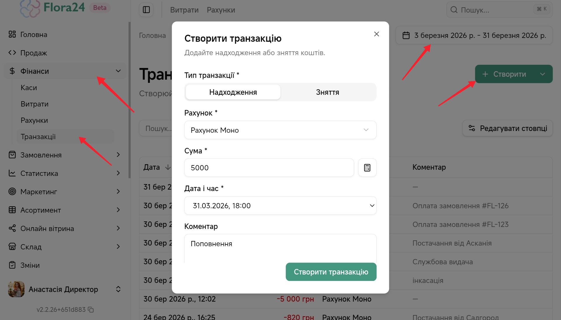Транзакції у Flora24 призначені для контролю руху коштів по рахунках. Тут відображаються всі надходження та витрати по готівкових і безготівкових рахунках з можливістю перегляду історії операцій за обраний період.
