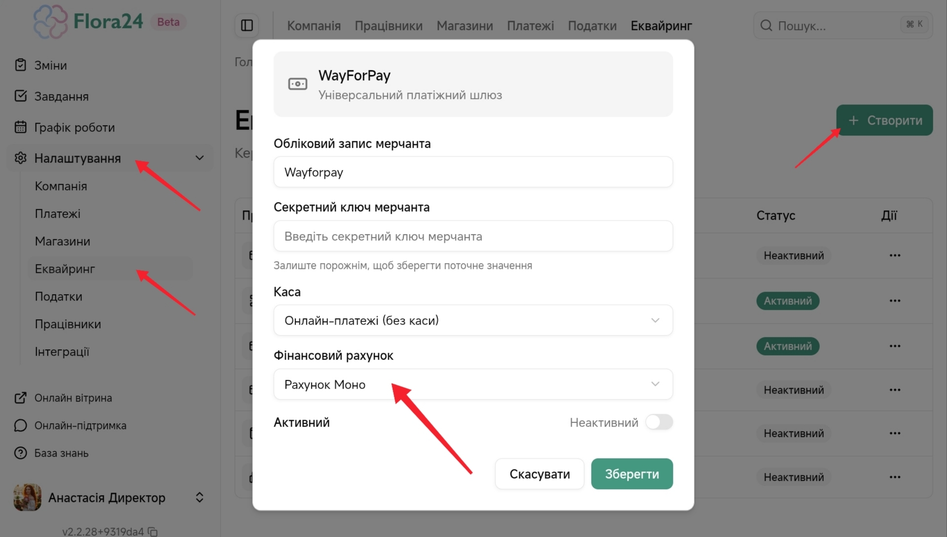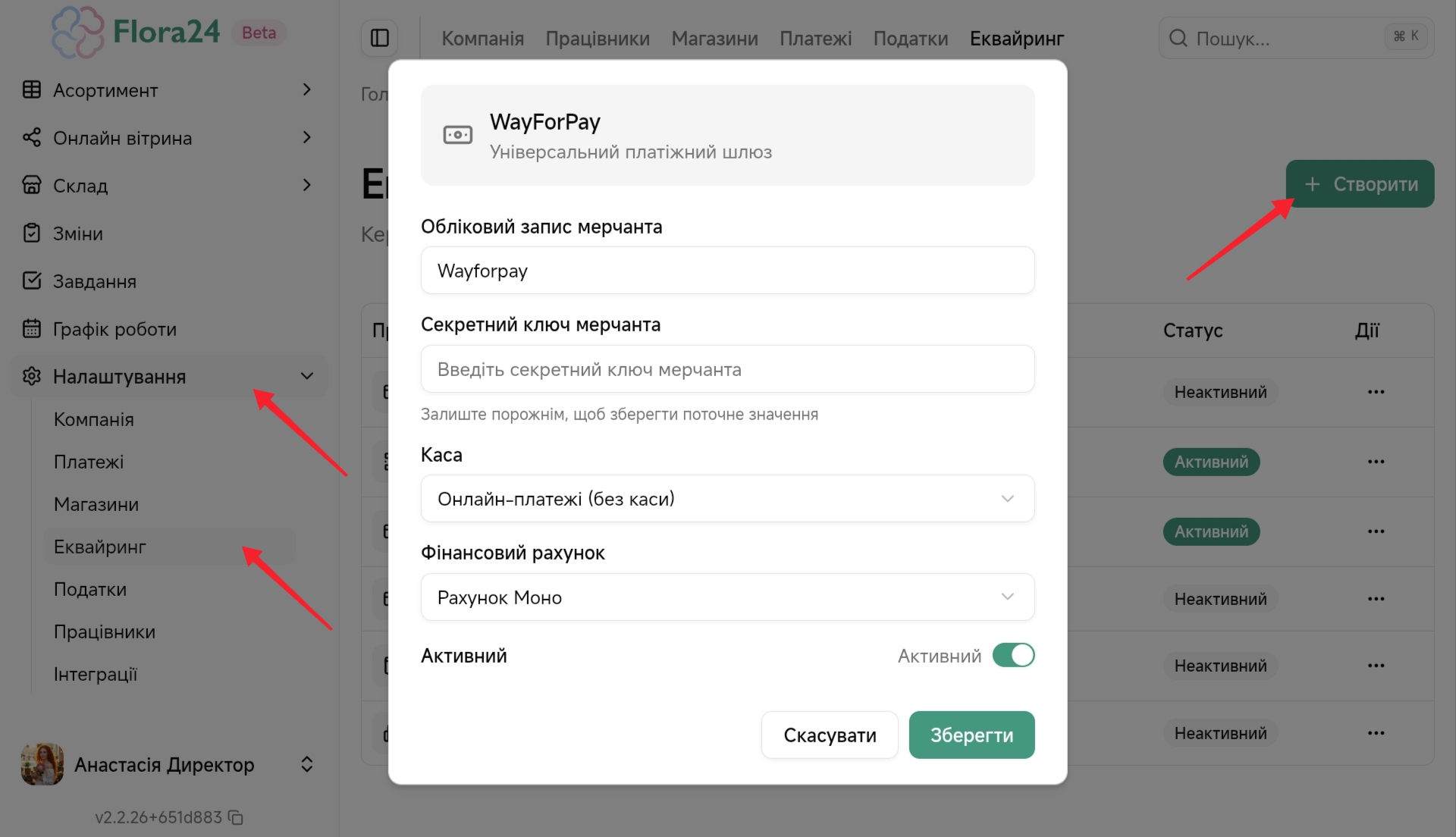 Прив’яжіть рахунок до платіжної системи, щоб кожна успішна оплата клієнтом автоматично фіксувалась на балансі у Flora24.