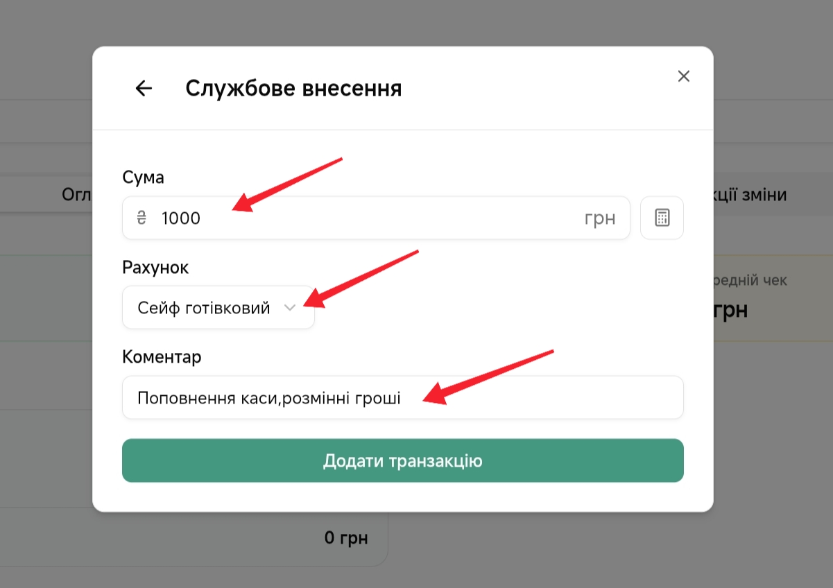 - Внесення готівки (кладемо гроші у касу, НЕ продаж)