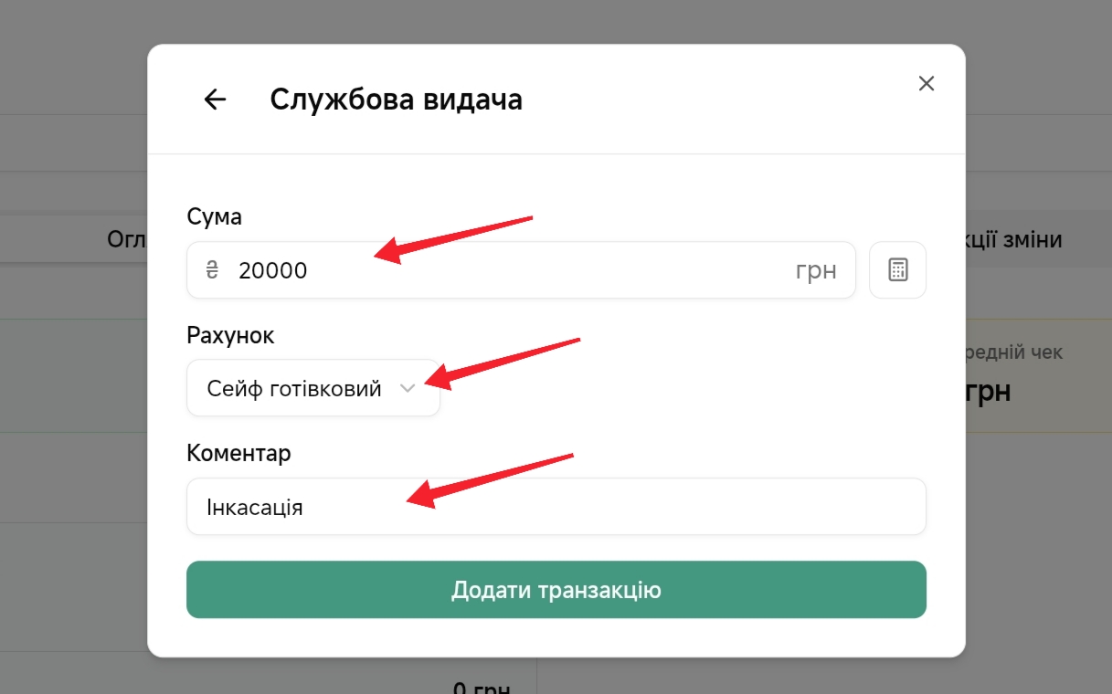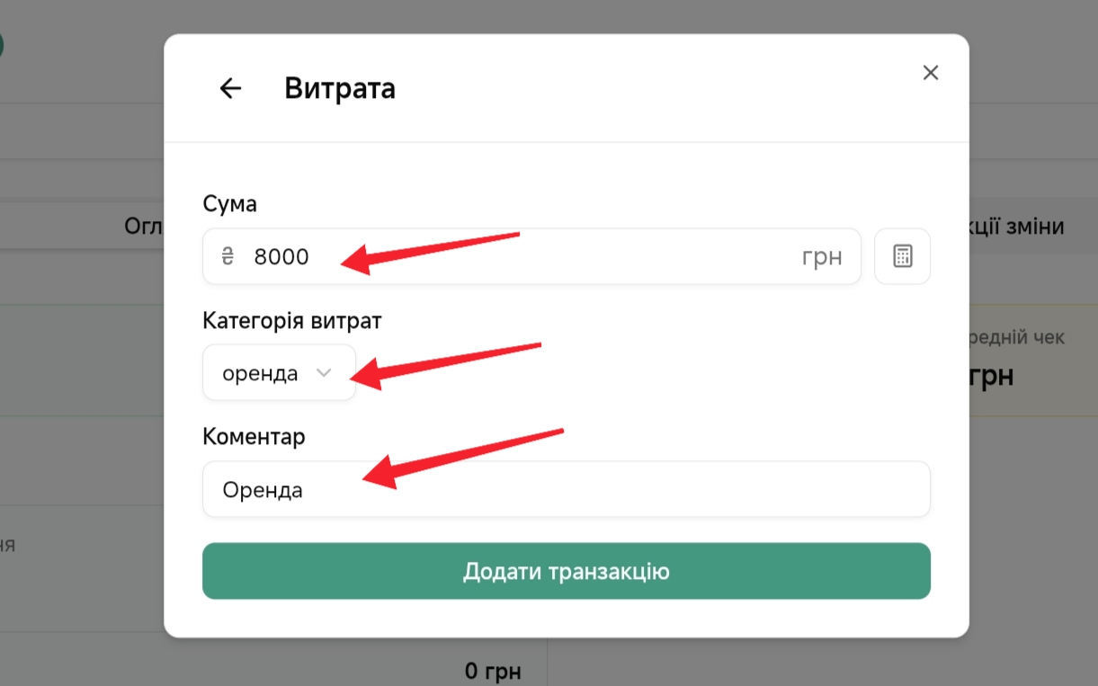 Для створення транзакції, якщо потрібно зафіксувати операцію, яка не створюється автоматично (наприклад: інкасація, оренда, закупівля, витрати на доставку), можна створити транзакцію вручну.