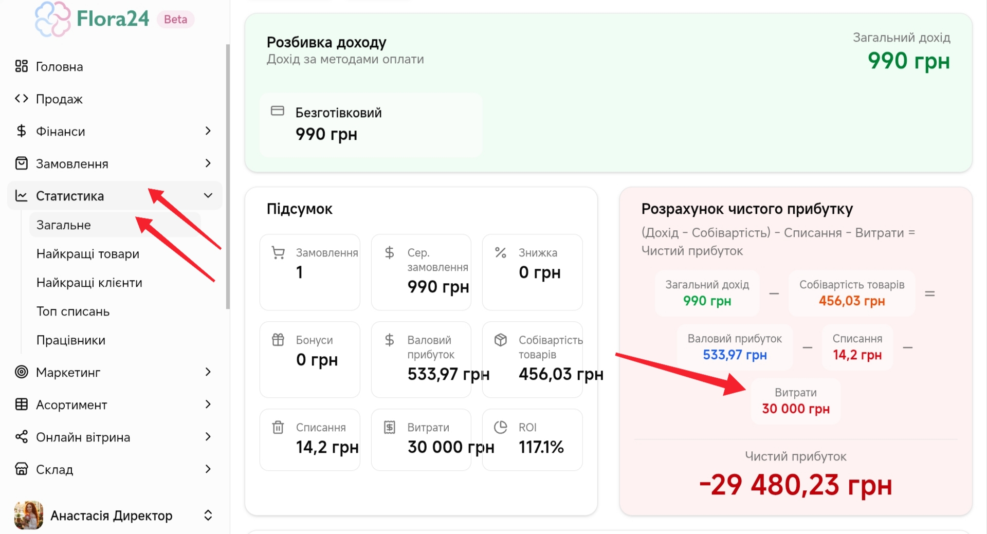 На сторінці Статистика → Загальна можна переглянути витрати на списання, витрати за проданими товарами та чистий прибуток магазину.