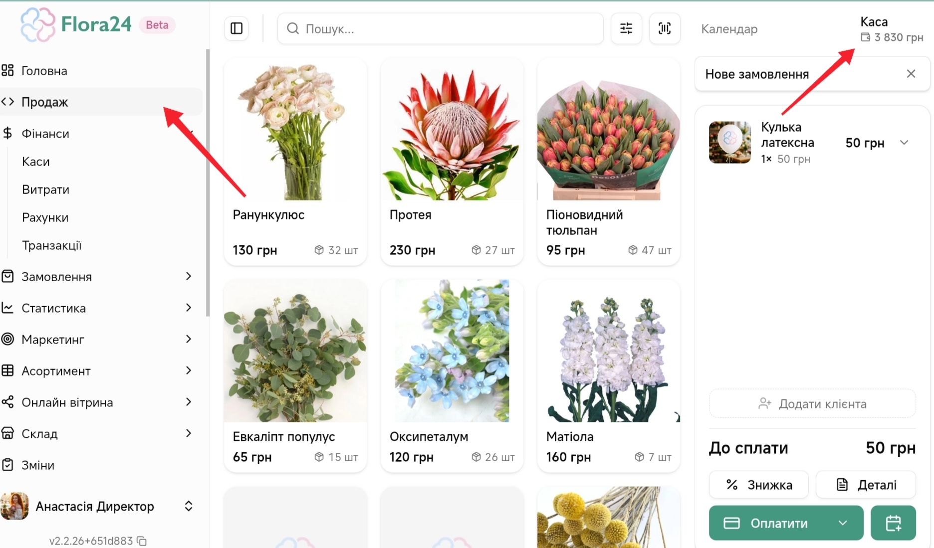- Продажі готівкою автоматично збільшують баланс каси. Продажі карткою/онлайн — не впливають на баланс каси.