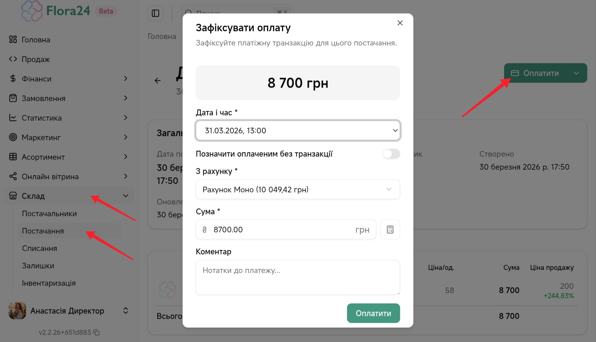 - Відкрийте завершену поставку та натисніть кнопку Сплатити