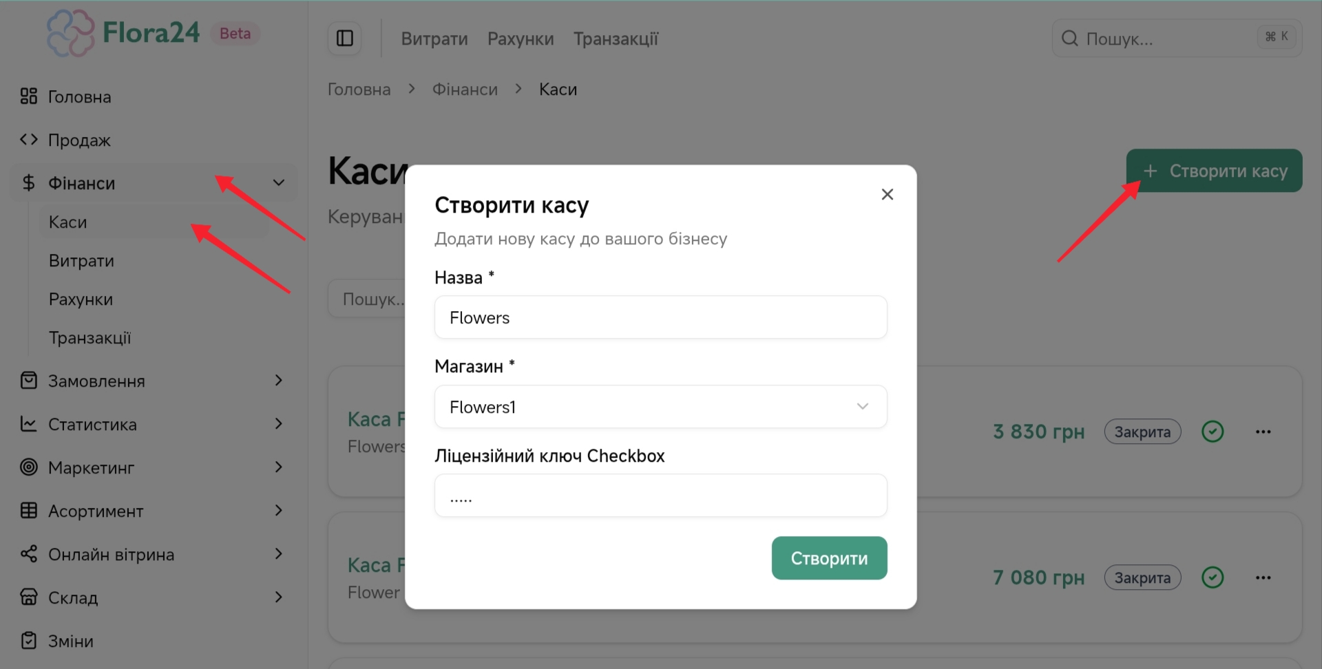 Кількість кас в програмі повинна відповідати фізичній кількості кас у вашому магазині. Якщо у вас одне касове місце, де ви проводите розрахункові операції — створюєте одну касу. Винятком може бути якщо друга каса у вас є і вона віртуальна. Якщо у вас активована інтеграція з ПРРО Вчасно.Каса або ПРРО Checkbox — каси в Checkbox/Вчасно.Каса мають бути звʼязані з касами у Flora24.