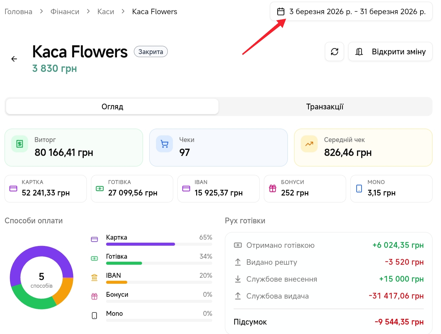 У верхньому правому куті доступний календар, який дозволяє переглядати інформацію по касі за обраний період або конкретну дату.