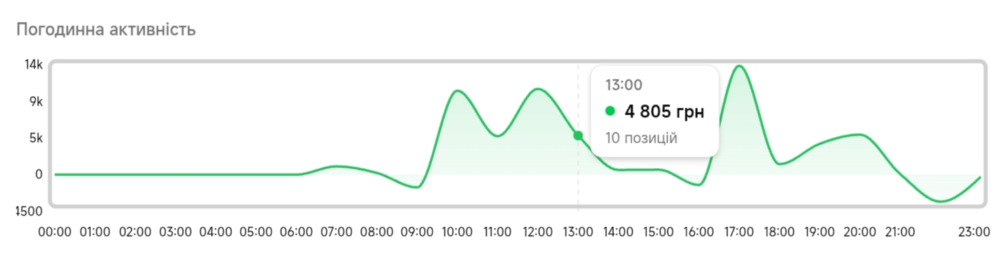 На цій сторінці відображається поточний стан каси: баланс каси, виторг, кількість чеків та середній чек, способи оплати, рух готівки (внесення, видача, решта), погодинна активність продажів.