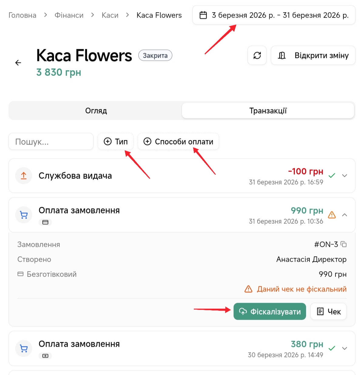 Транзакції — містить повну історію операцій: оплати замовлень, службові внесення, службові видачі, витрати, дата, час та сума операції, фільтр за типом та способом оплати. Також можливо фіскалізувати чеки які потрібно.