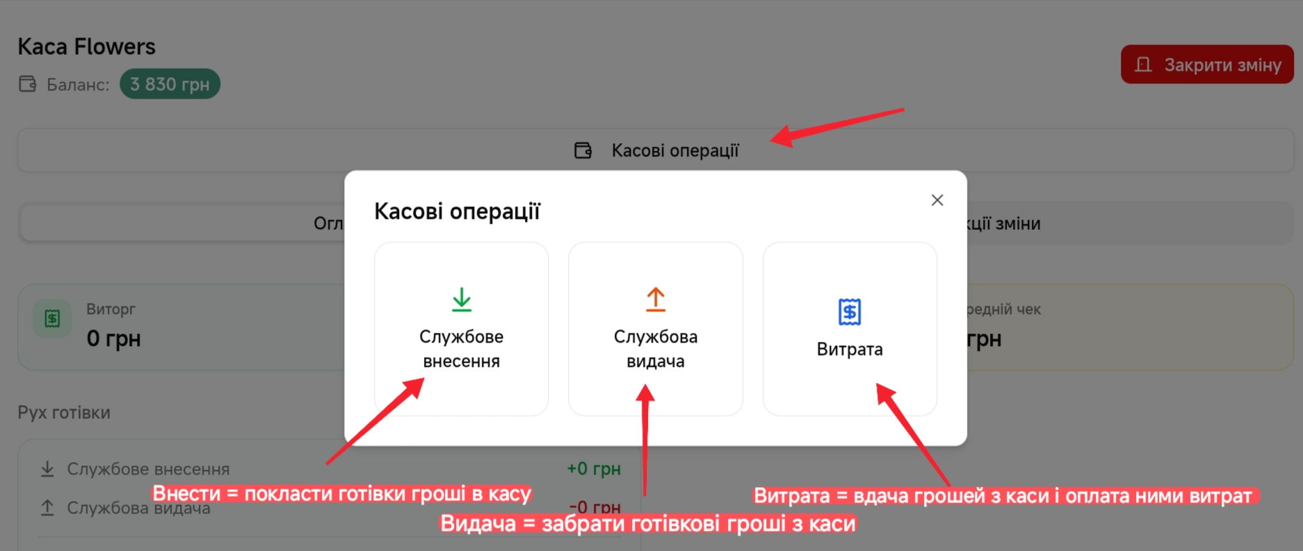 - Якщо витрата відбувається з готівкової каси, то її потрібно вносити з вікна касових операцій на екрані продажу. При цьому автоматично відбудеться службове винесення готівки з каси і створиться витрата.