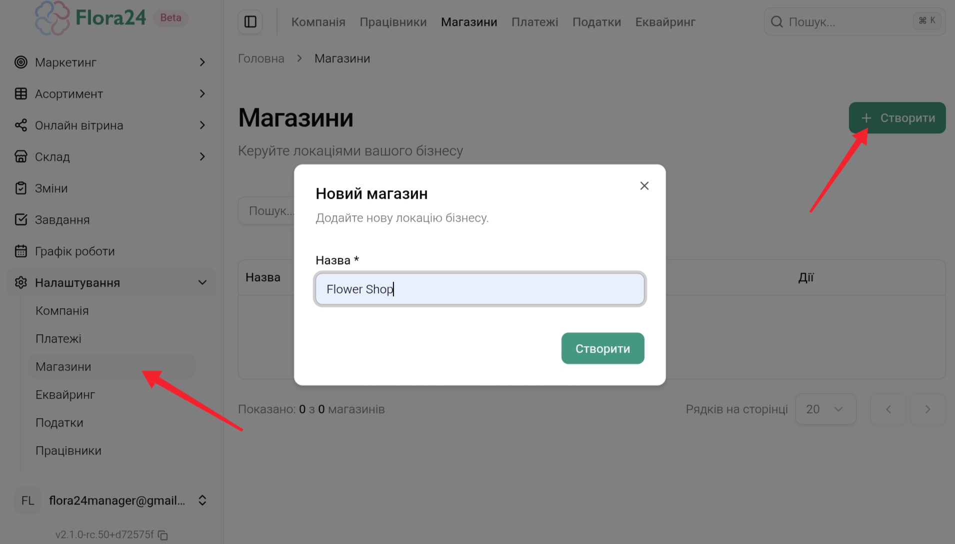 Щоб створити магазин на адмінпанелі перейдіть Налаштування → Магазини → Створити