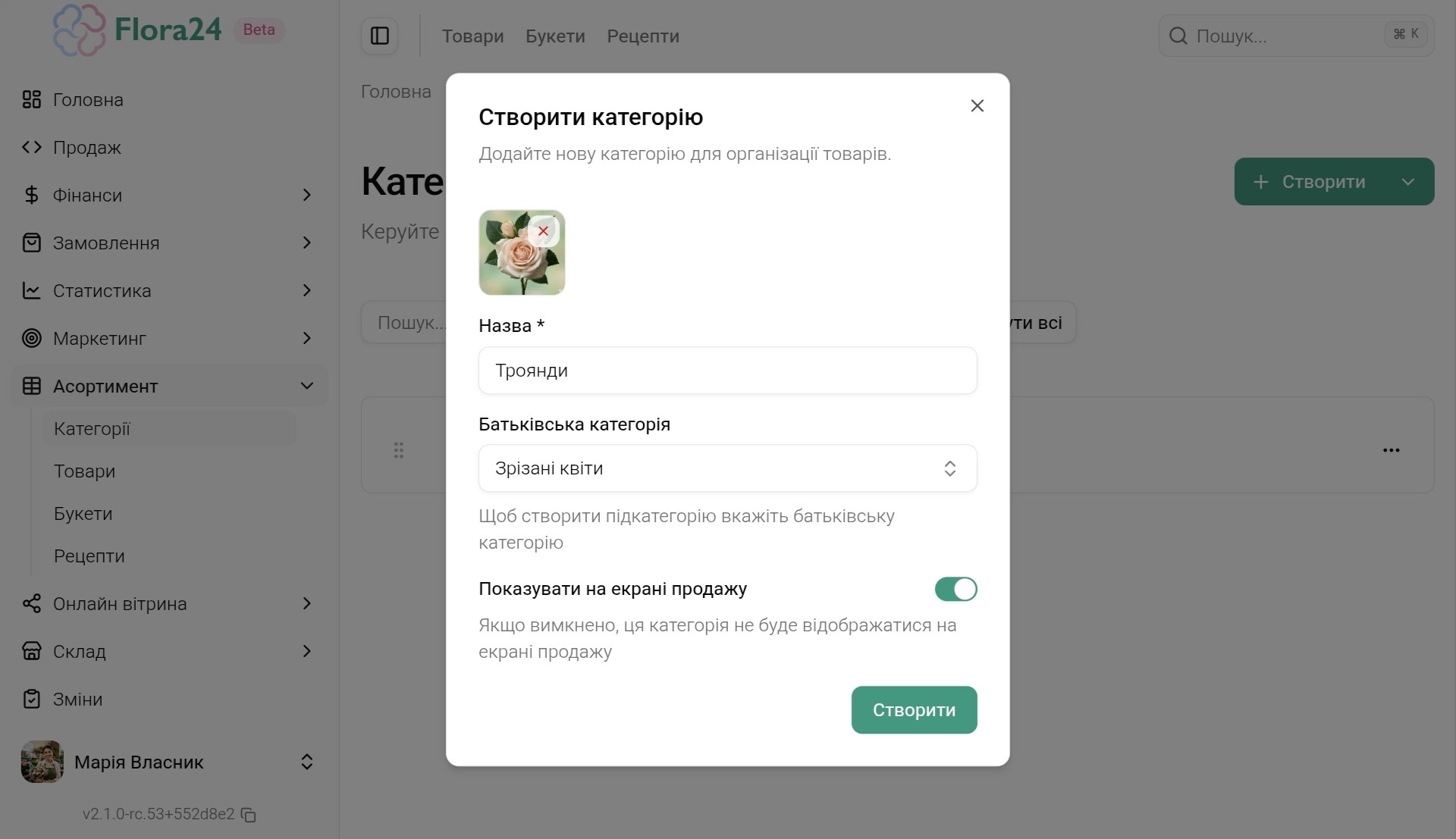 Створіть основні категорії товарів (наприклад: “Зрізані квіти”, “Букети”, “Пакування”).