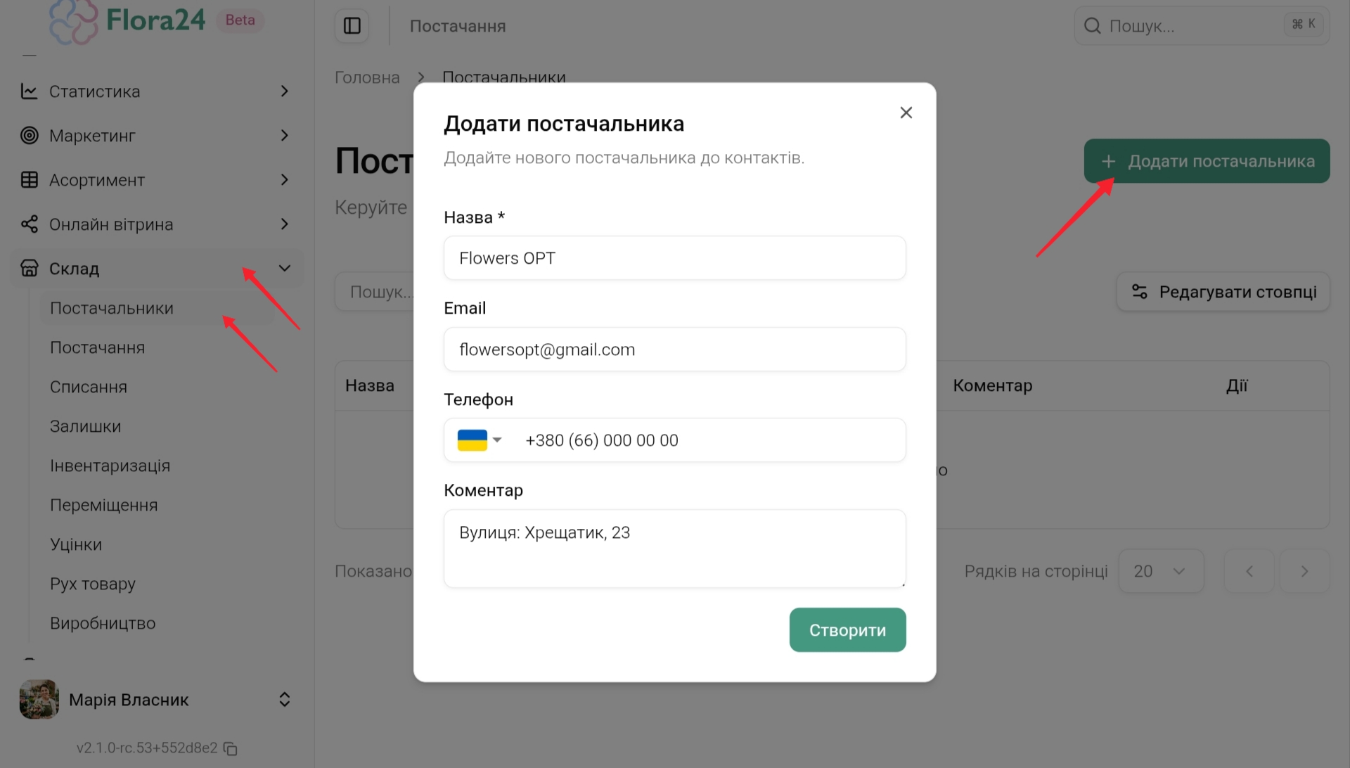 Перейдіть Склад → Постачальники → Додати постачальника