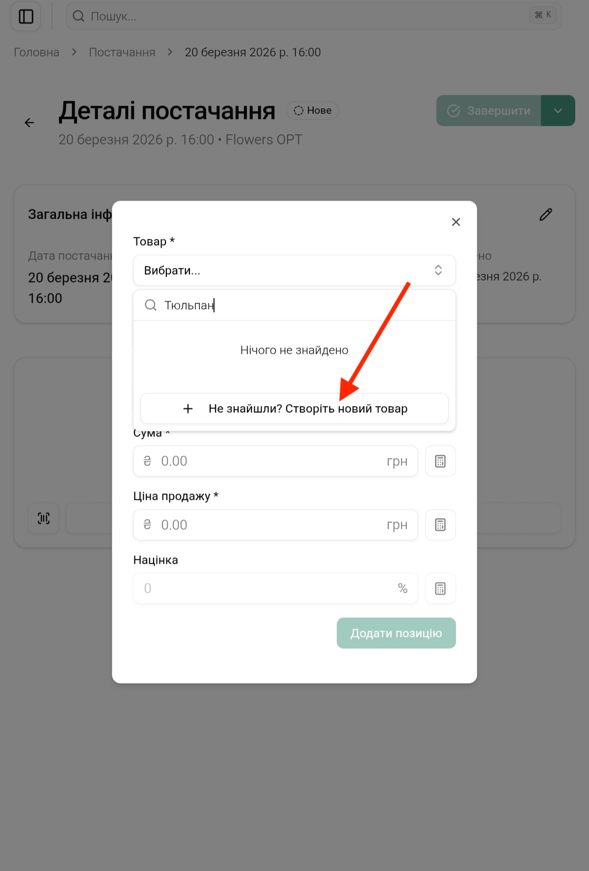 Натисніть Додати позицію → Створити новий товар