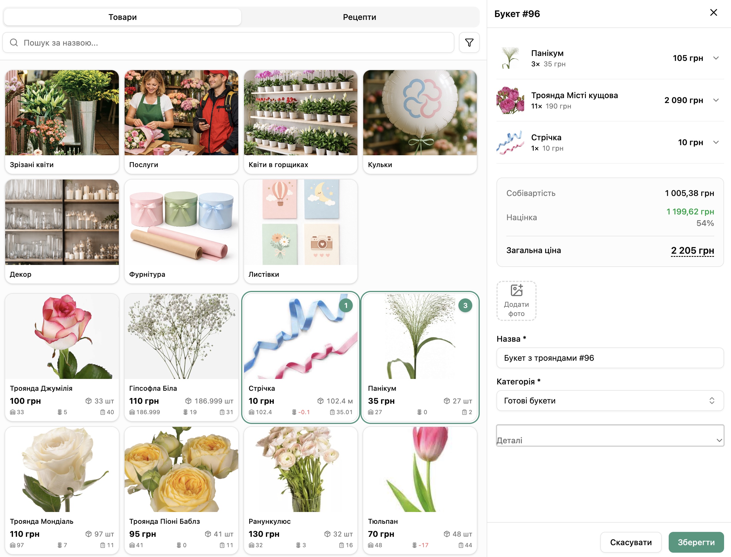 Після додавання товарів ви можете створити готові букети.