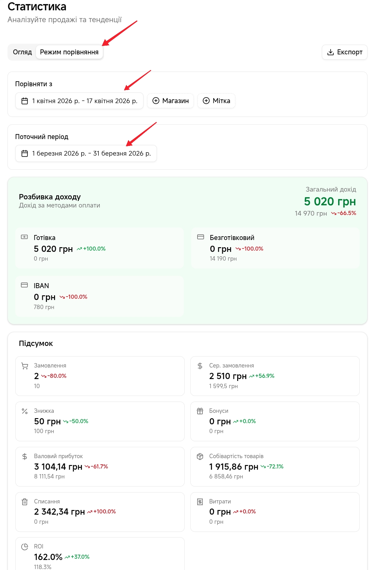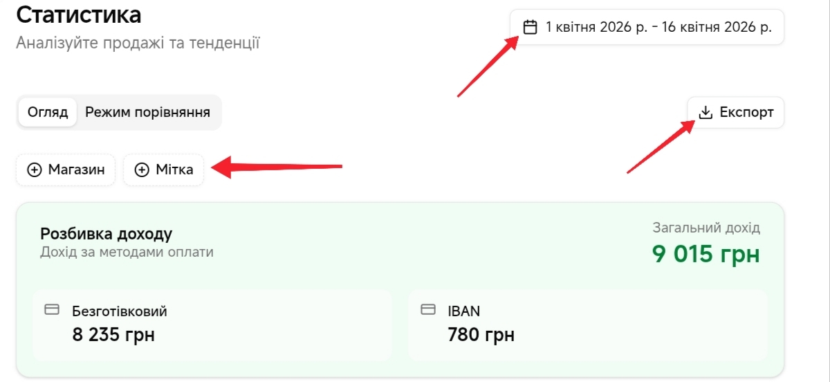 - Період — оберіть дати у правому верхньому куті, щоб переглянути статистику за потрібний час;