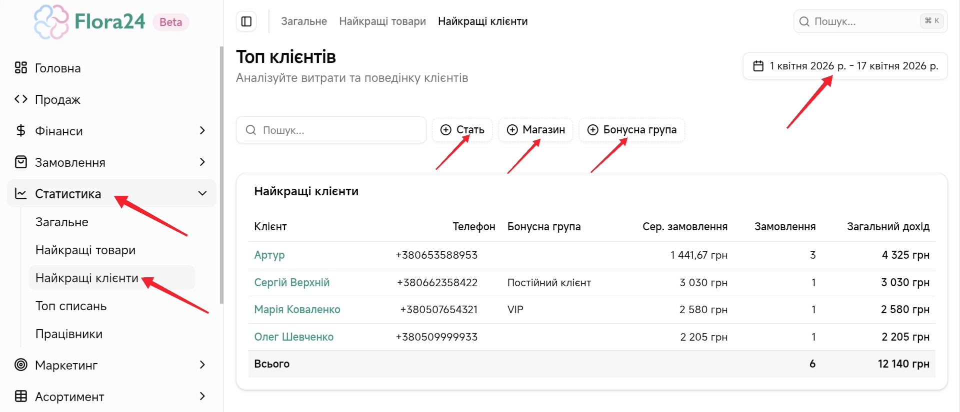 Щоб перейти до аналітики клієнтів, перейдіть в адмін-панель та оберіть Статистика → Найкращі клієнти.