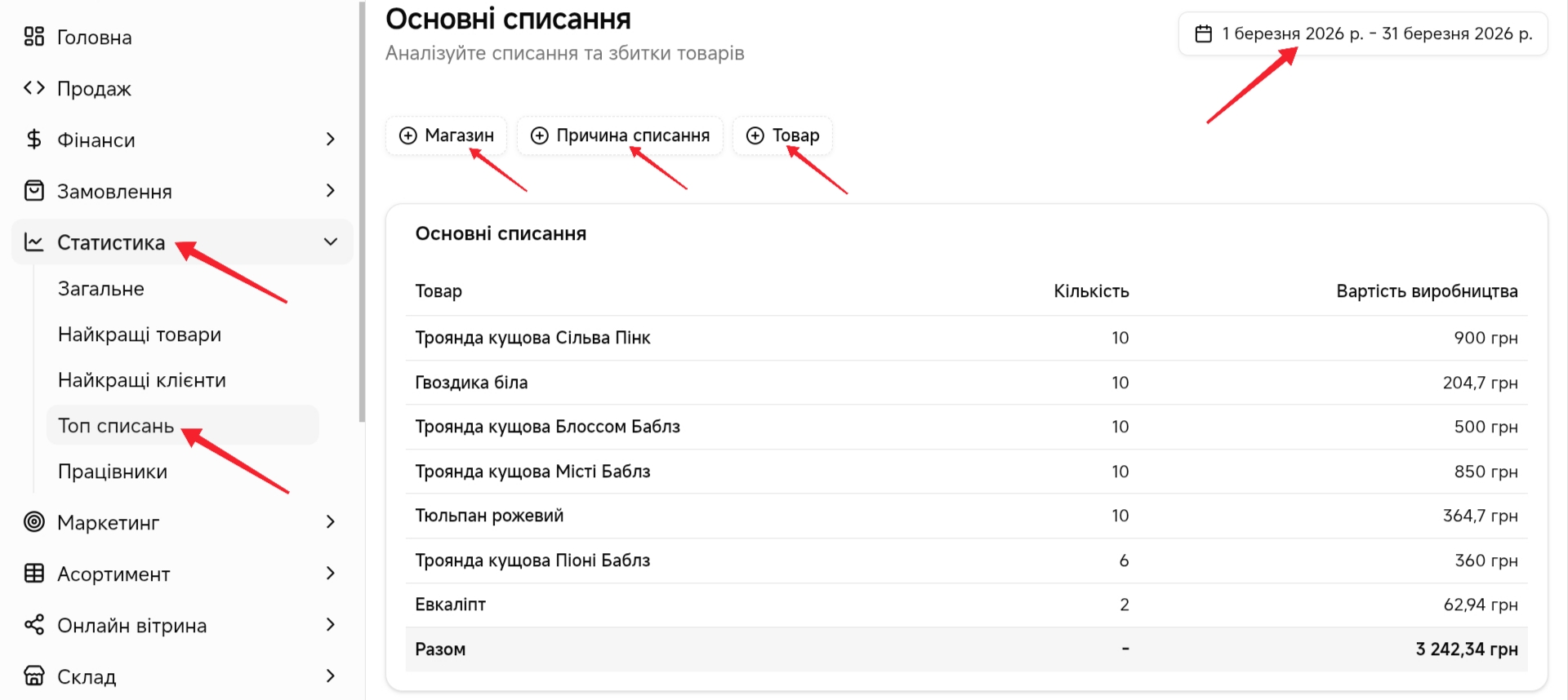 Щоб переглянути списання товарів, перейдіть в адмін-панель та оберіть Статистика → Топ списань.