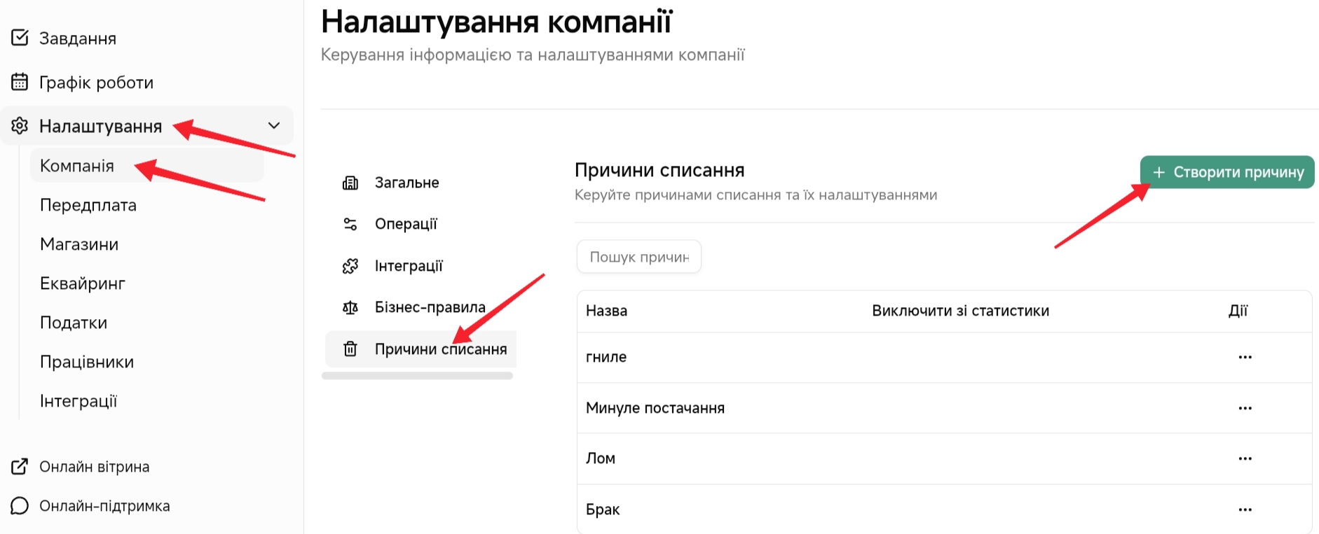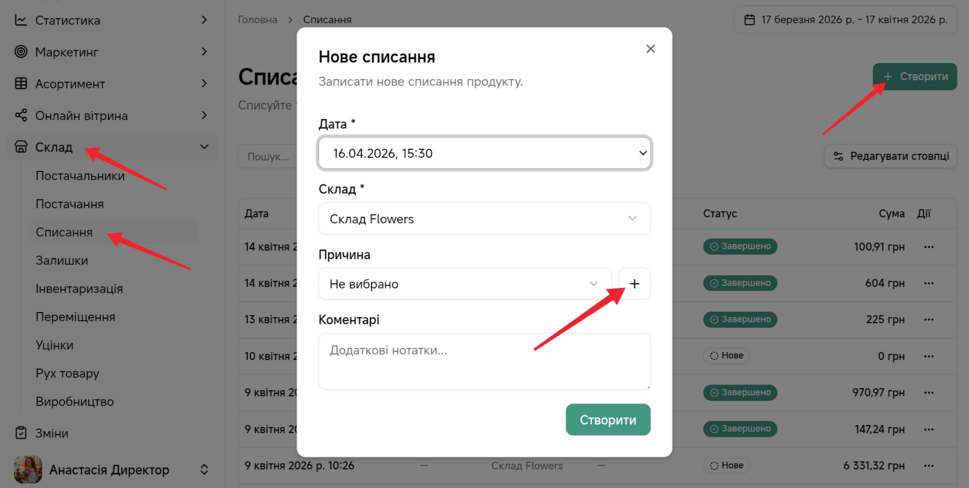 Для того щоб фільтр по причинам списання працював, попередньо потрібно створити причини та додавати при списанні. Створити можливо при створені списання натиснувши на кнопку +.