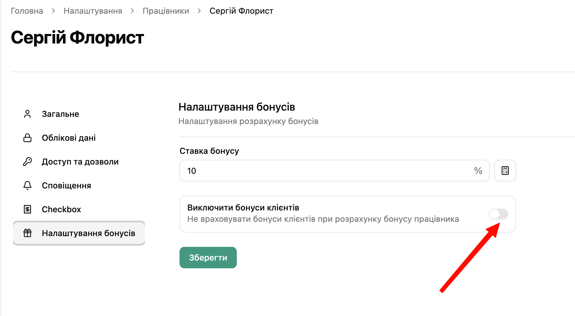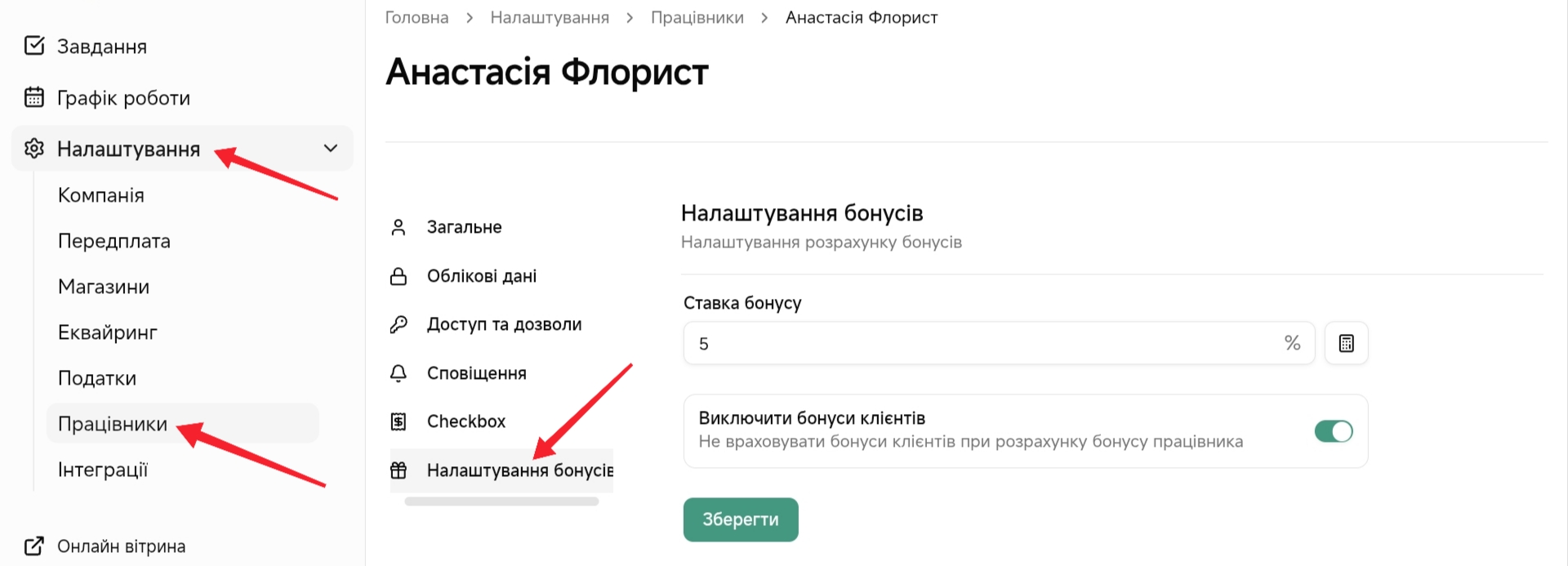 Перейдіть у Налаштування → Працівники, оберіть працівника та натисніть в Дії на три крапки (…) → Редагувати. Перейдіть у розділ Налаштування бонусів та встановіть ставку бонуса у відсотках.