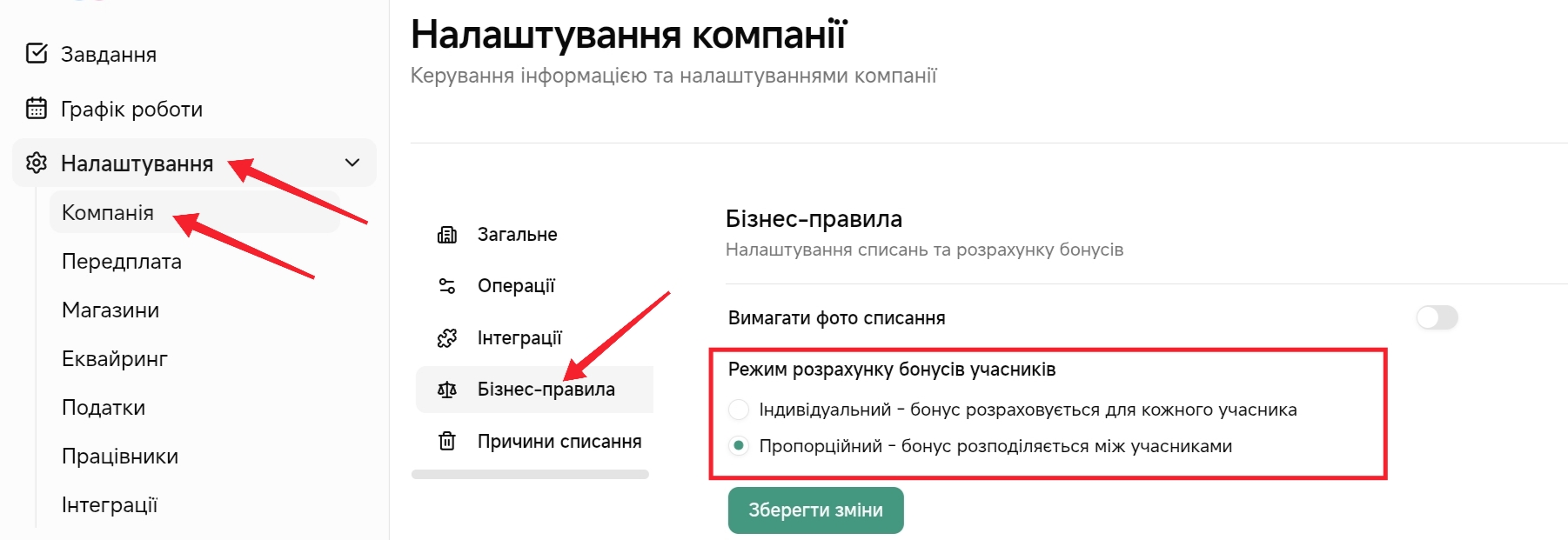 Щоб налаштувати режим розрахунку бонусів, перейдіть в адмін-панель та оберіть Налаштування → Компанія → Бізнес-правила.