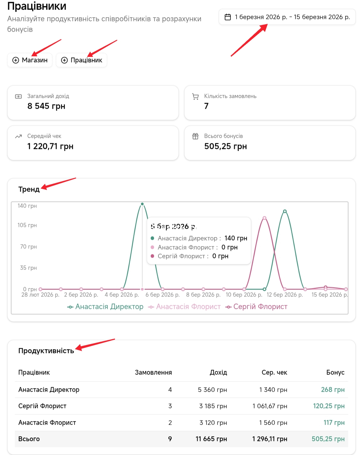 Flora24 спрощує нарахування бонусів а також дозволяє проаналізувати та порівняти ефективність роботи флористів.