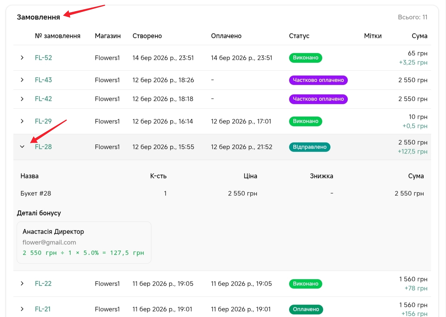 При натисканні на замовлення можна переглянути деталі, включаючи розрахунок бонусу.