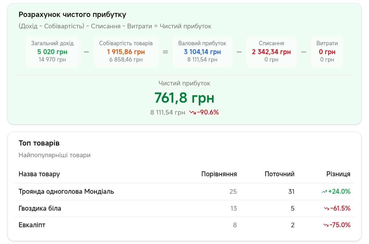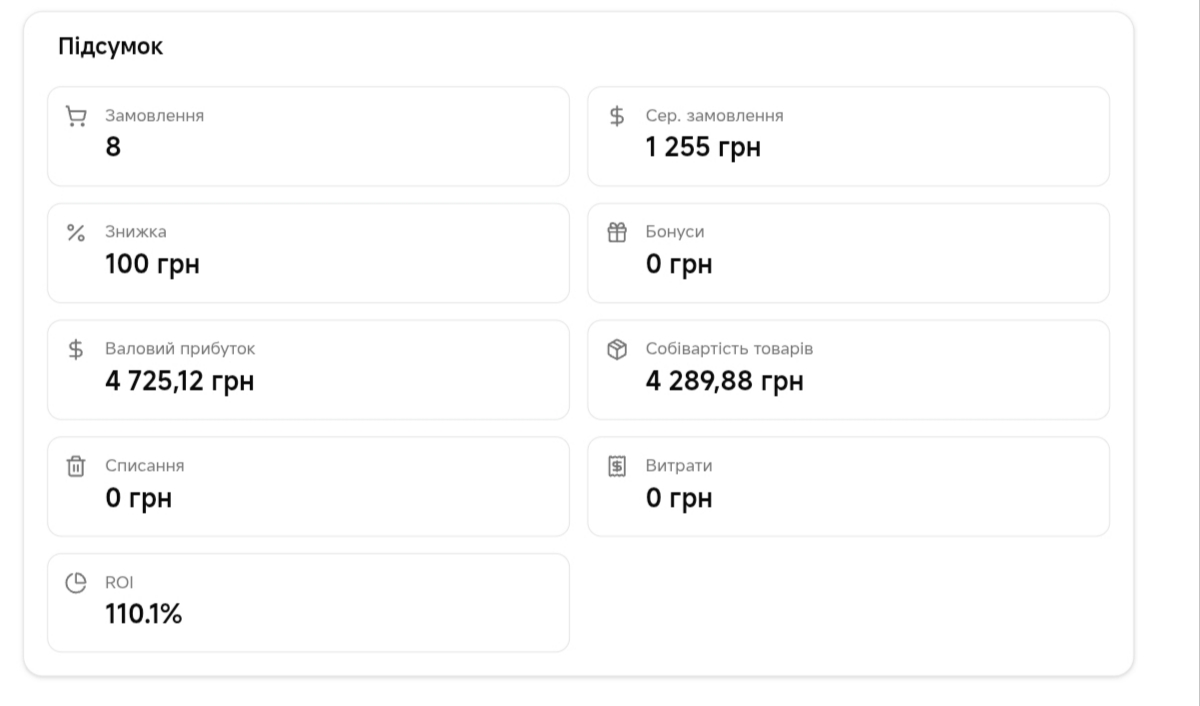 У цьому блоці відображаються основні показники, які допомагають оцінити результати роботи бізнесу за обраний період.