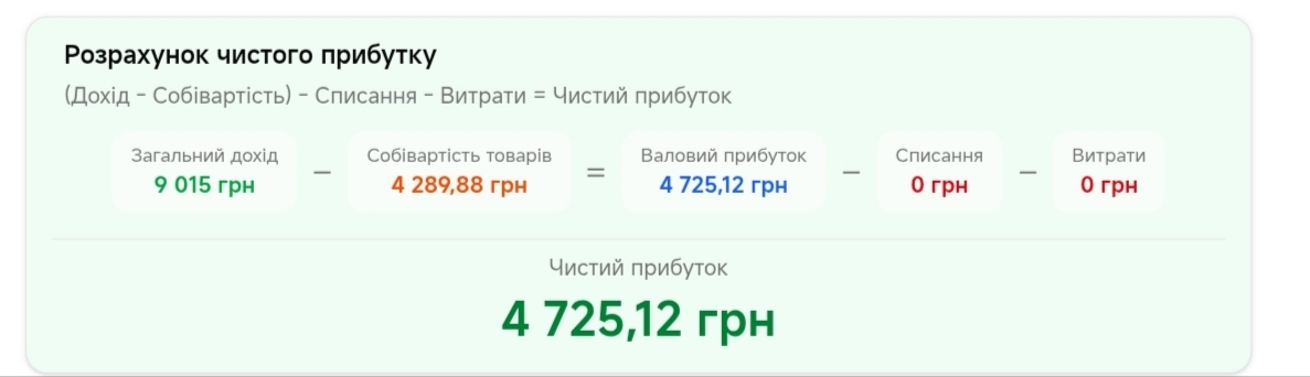 Дохід – Собівартість – Списання – Витрати = Чистий прибуток