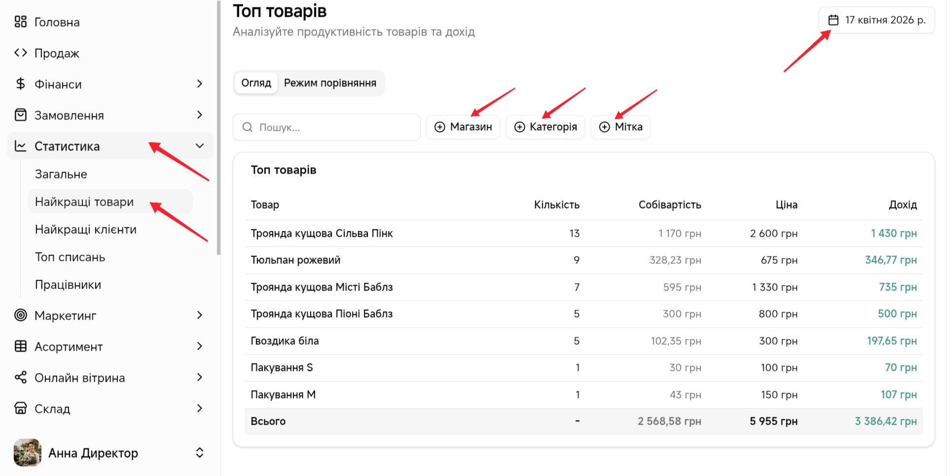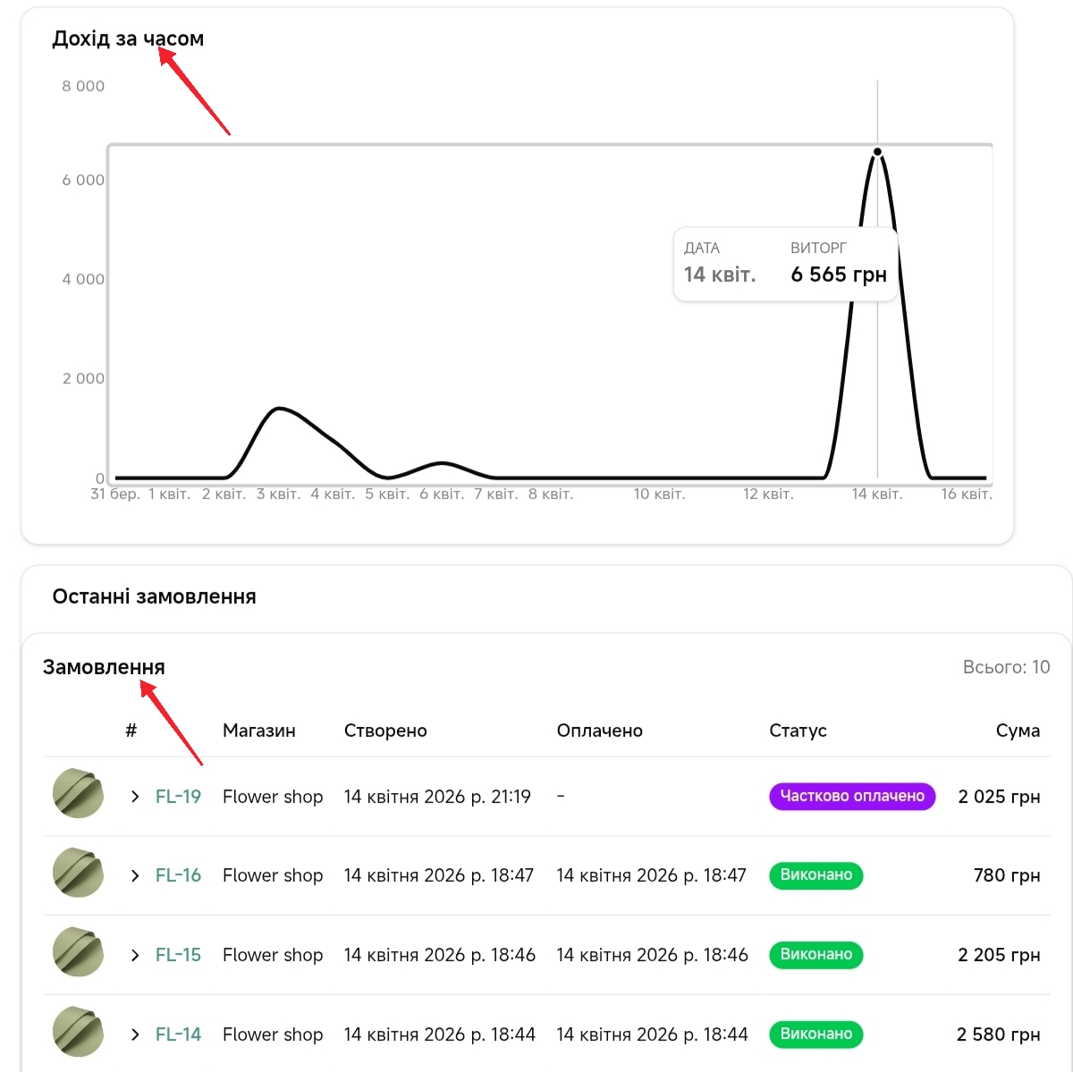 Розділ Статистика дозволяє відстежувати дохід, аналізувати продажі товарів, поведінку клієнтів та ефективність роботи команди.