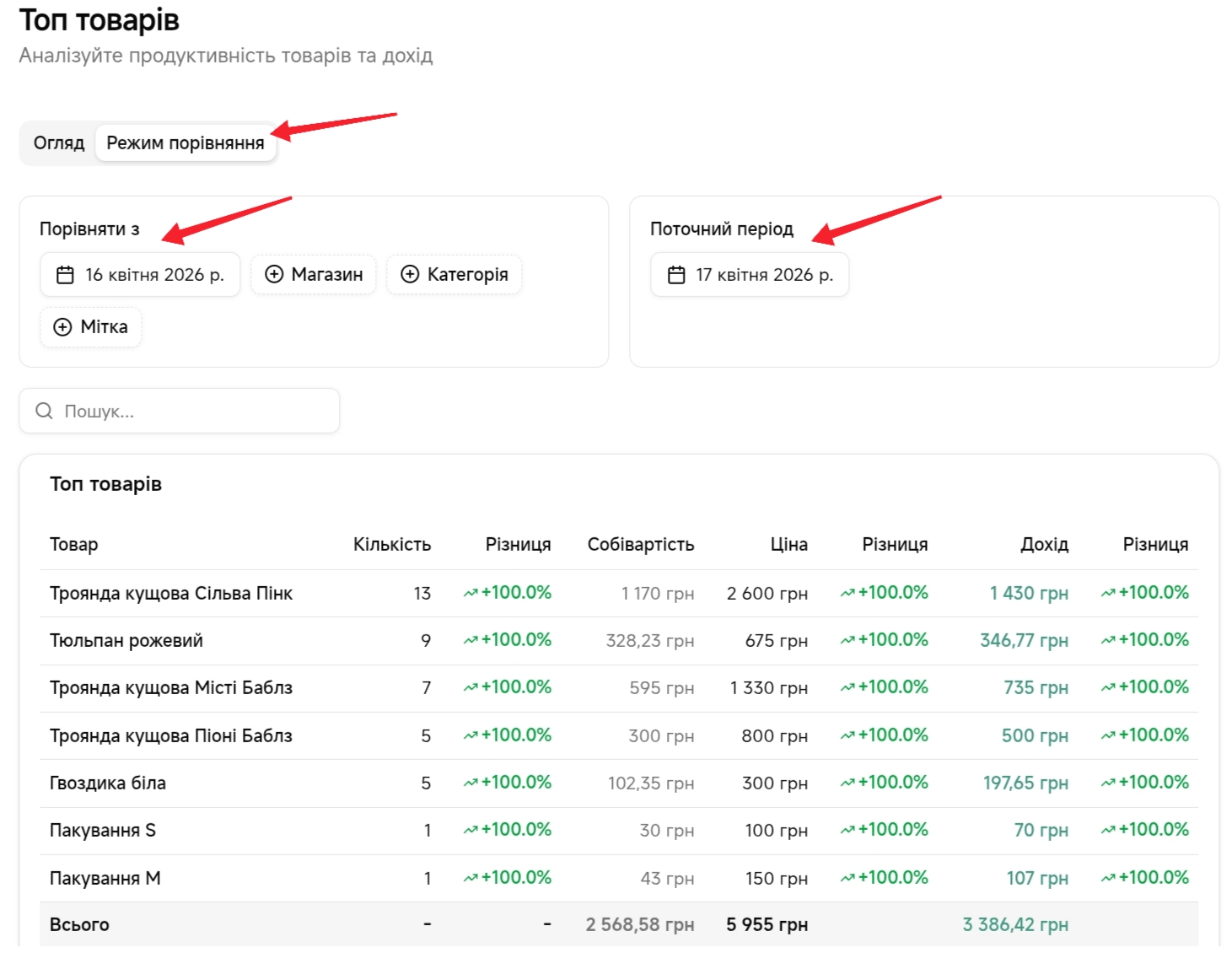Перемикається у верхній частині сторінки. Сторінка надає можливість порівняти два періоди, побачити зміни по кожному товару, оцінити ріст або падіння (у %).