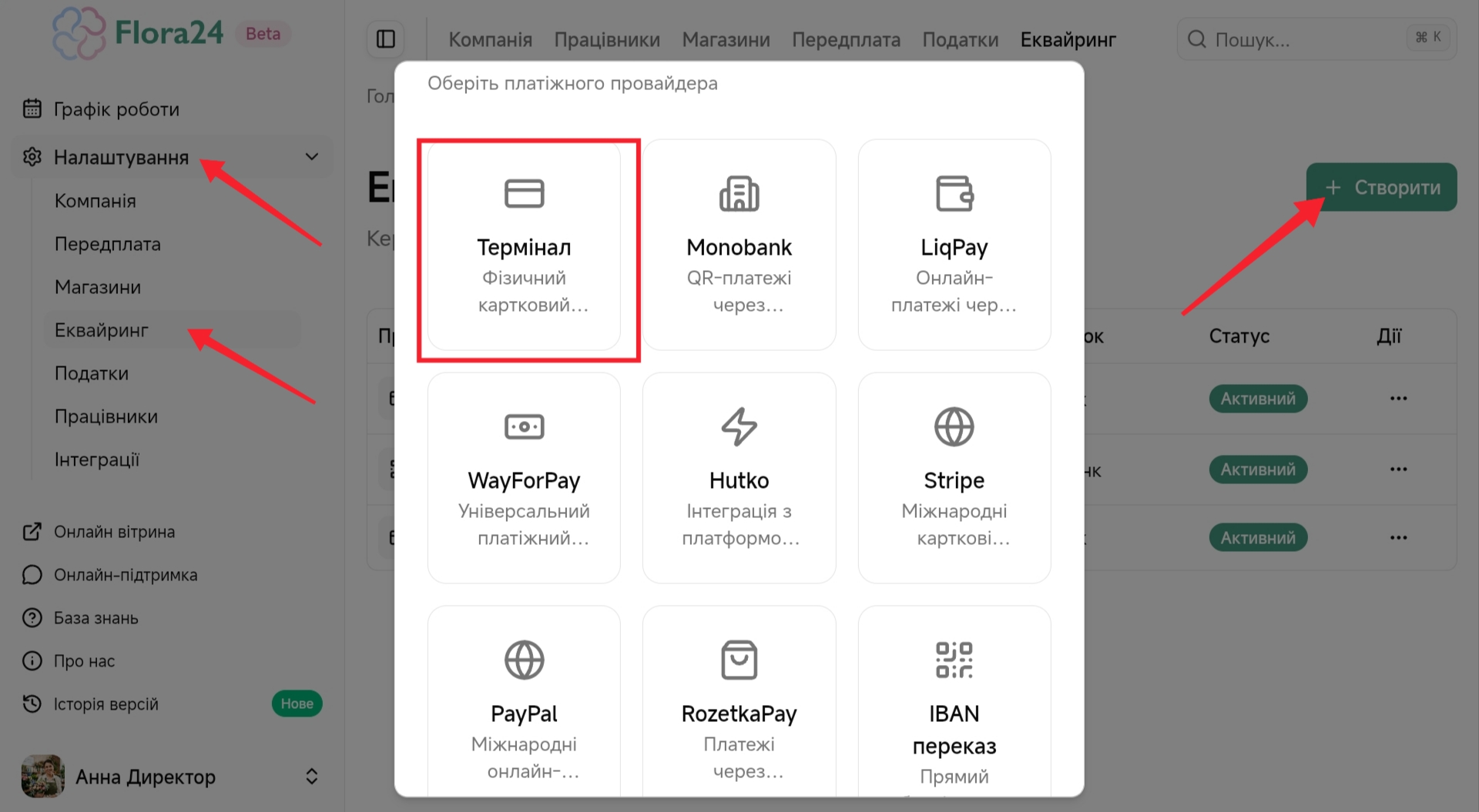 Еквайринг — це прийом безготівкових платежів від клієнтів через різні платіжні системи. У Flora24 можна підключити одразу кілька способів оплати: банківські термінали, онлайн-сервіси (Mono, LiqPay, WayforPay тощо) та оплату за IBAN.